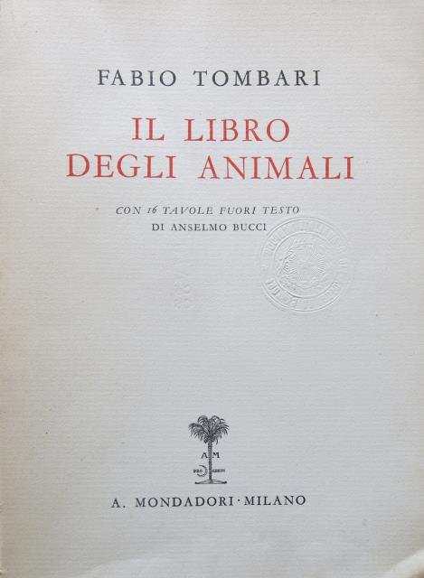 Mondadori, Milano, 16 maggio 1935 – XIII. Prima edizione. Collana “I libri curiosi”. Con 16 tavole f. t. di Anselmo Bucci. In 8vo grande, front. in rosso /nero, pp. 234 (con l' Elenco degli animali compresi nel testo), leg. edit. in tutta tela rossa. Manca la sovrac., tracce di umido alla brossura e alcuni usuali segni del tempo.