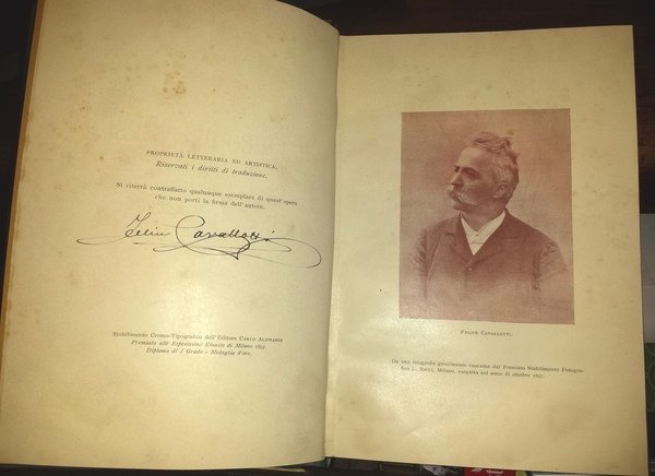In-8 (21 cm)(1) c. (ritratto dell'autore) 369 (14) c. (di tav.). Frontespizio in rosso e nero. Pieno cartoncino. Firma e dedica dell'autore a Riccardo Selvatico datata 21/01/1898. Felice Carlo Emanuele Cavallotti (Milano, 6 ottobre 1842 – Roma, 6 marzo 1898) è stato un politico, poeta, drammaturgo e patriota italiano, fondatore, insieme ad Agostino Bertani, dell'Estrema sinistra storica, movimento attivo tra il 1877 e l'avvento del Partito Radicale Italiano (1904). Fu soprannominato "il bardo della democrazia".Volontario garibaldino in gioventù, benché la sua fama sia oggi molto inferiore a quella di Mazzini e Garibaldi presso il grande pubblico, all'epoca era considerato tra i primi eredi politici dei due protagonisti del Risorgimento.Politico idealista e appassionato, combatté molte battaglie per la giustizia sociale e una società autenticamente libera, oltre che contro la corruzione e il colonialismo della classe dirigente crispina. Cavallotti fu considerato il capo incontrastato dell'"Estrema sinistra" nel parlamento dell'Italia liberale pre-giolittiana. Morì tragicamente a 56 anni, dopo essere stato ferito gravemente in duello dal giornalista conservatore Ferruccio Macola. Oratore efficace, l'opera poetica di Cavallotti è invece considerata più significativa per l'aspetto politico che per la qualità letteraria, ed è principalmente di ispirazione civile e sociale, e in parte anche lirica, simile alla poesia carducciana per quanto riguarda la forma metrica tradizionale. La maggioranza delle sue opere poetiche sono scritte secondo la metrica classica.