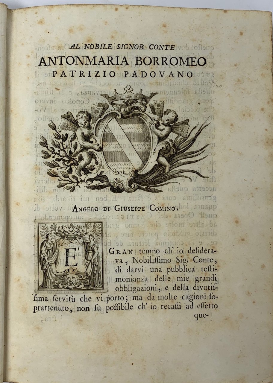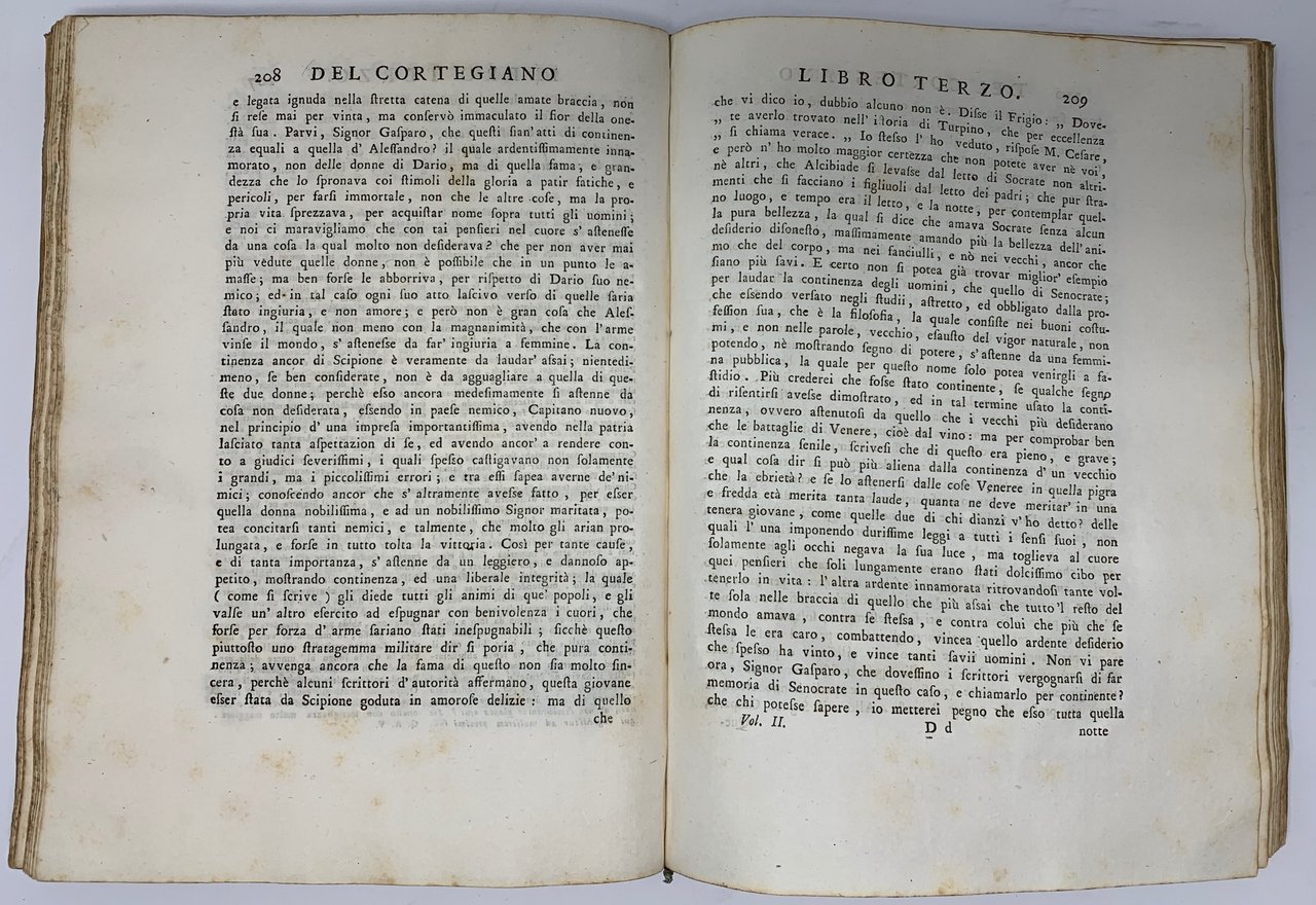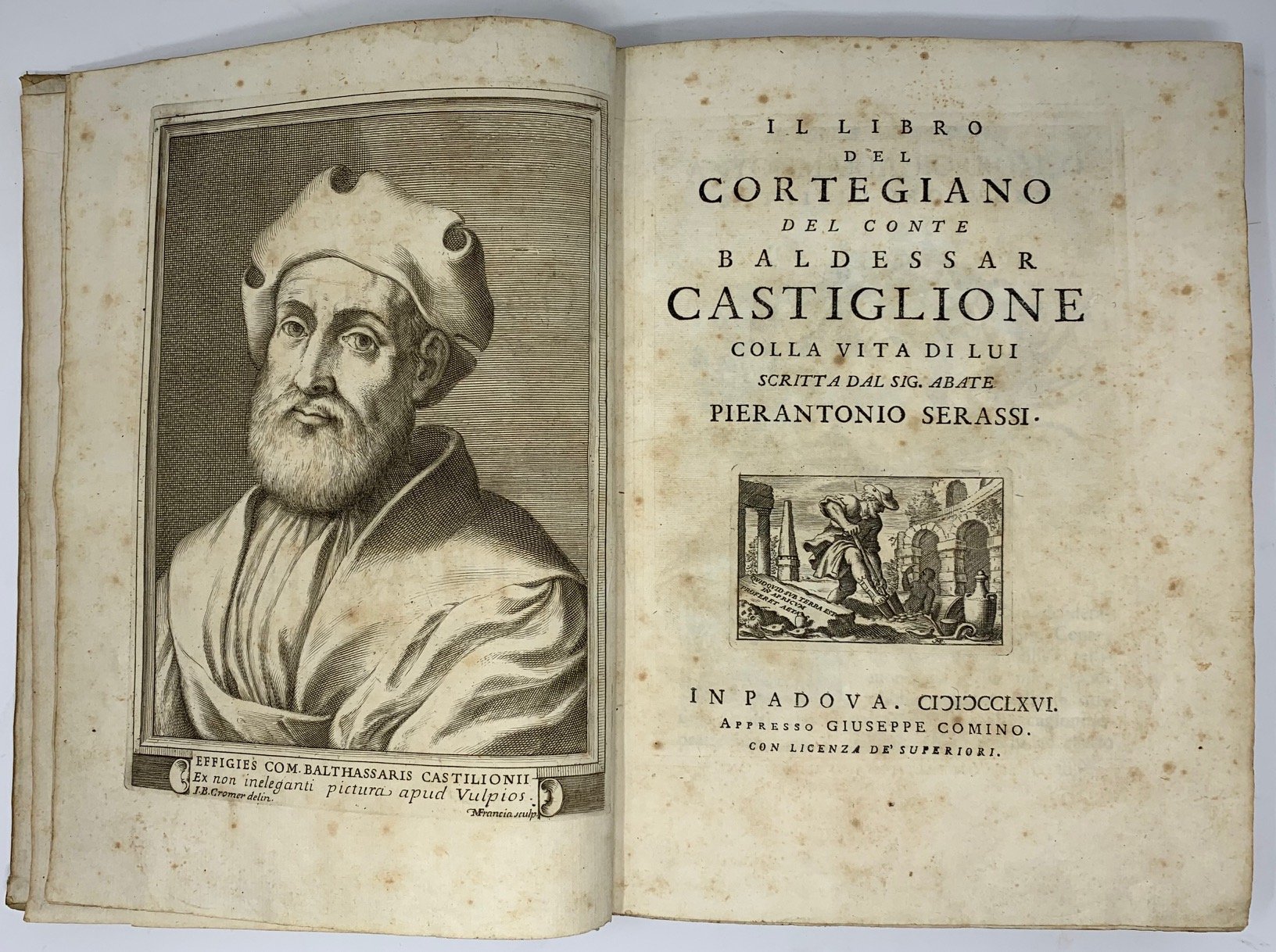 >in-4, pp. XXIV, 352, legatura coeva p. perg., tit. oro al dorso (difetti alle cuffie). Con un magnifico ritratto dell'autore in antiporta finem. inciso in rame da F.M. Francia, impresa tipogr. sul titolo, stemma di Antonmaria Borromeo, cui l'opera è dedicata dal Comino, testatine, finaletti ed iniz. elegantem. inc. "Ristampa molto pregevole" dell'edizione Comino del 1733, curata da Gius. Gennari e la prima con la Vita di Castiglione scritta dal Serassi, di uno dei libri più noti e rappresentativi del Rinascimento italiano. Bell'esemplare marginoso, leggero spotting su alcuni fogli iniziali e finali. Gamba 296, note. Razzolini 99.