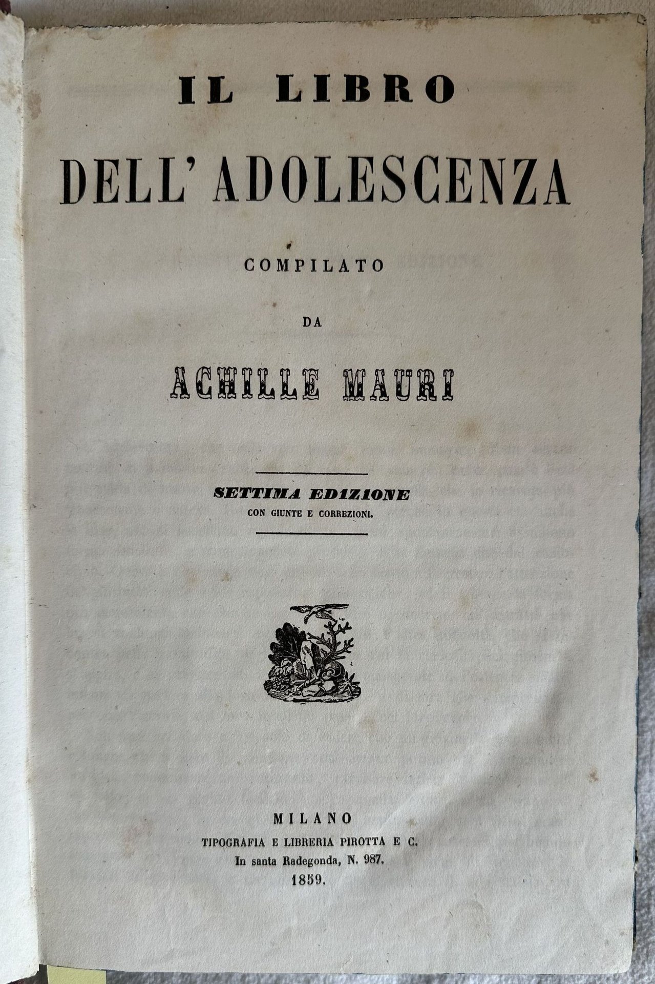 Edizione del 1859 di questa crestomazia di storico-letteraria di autori vari a scopo pedagogico per il periodo adolescenziale. La prima edizione dell'opera venne criticata e censurata in alcune parti, ritenute non adatte a dei ragazzi. Tagli marmorizzati In buone condizioni. Copertina in mezza tela in ottime condizioni generali con usure ai piatti e margini. Legatura in buone condizioni. All'interno le pagine si presentano in ottime condizioni con rare fioriture. In 8. cm 25,5x17,5. Pp. 414.