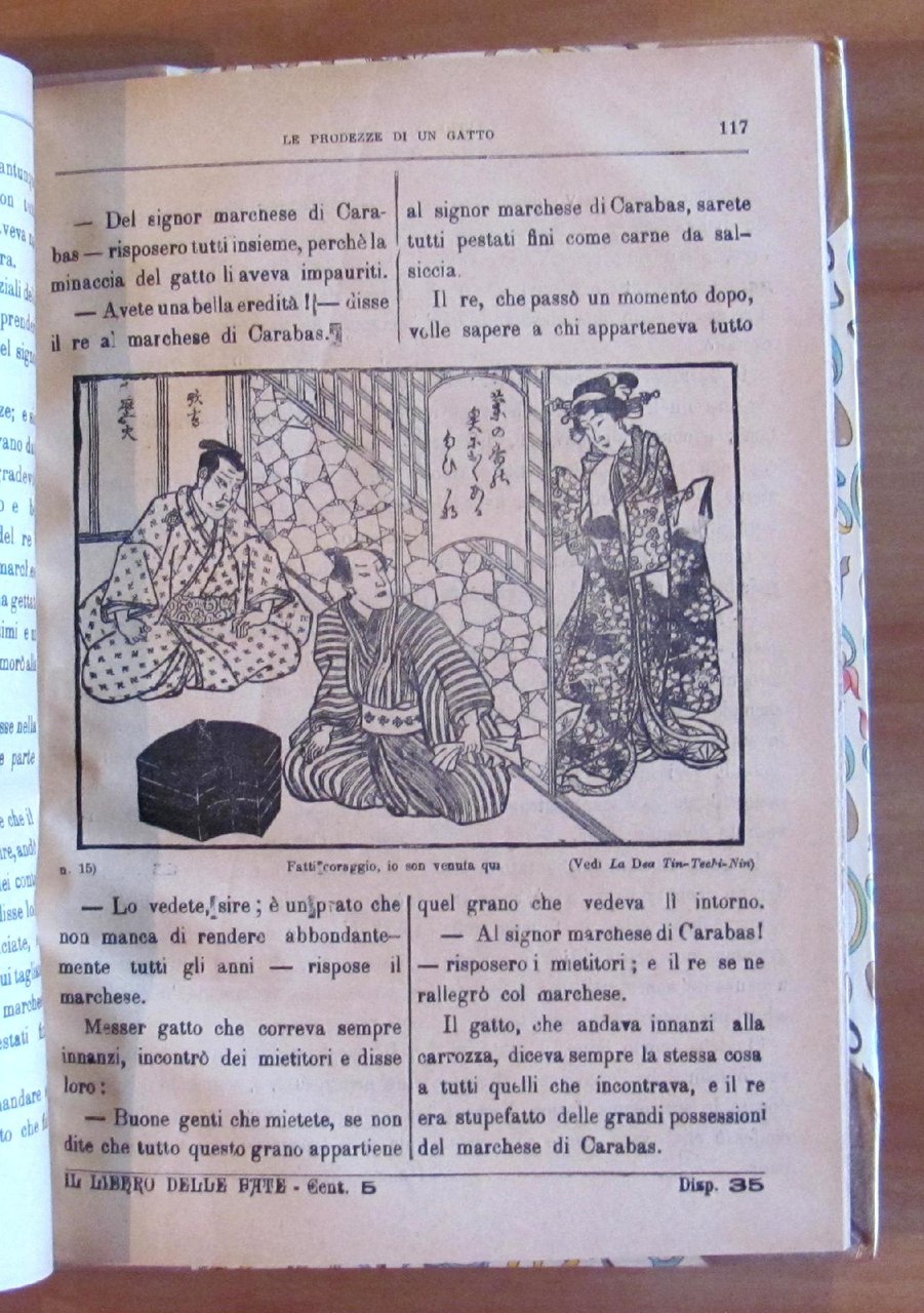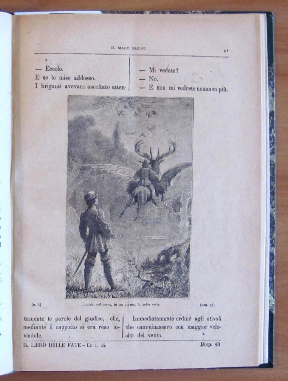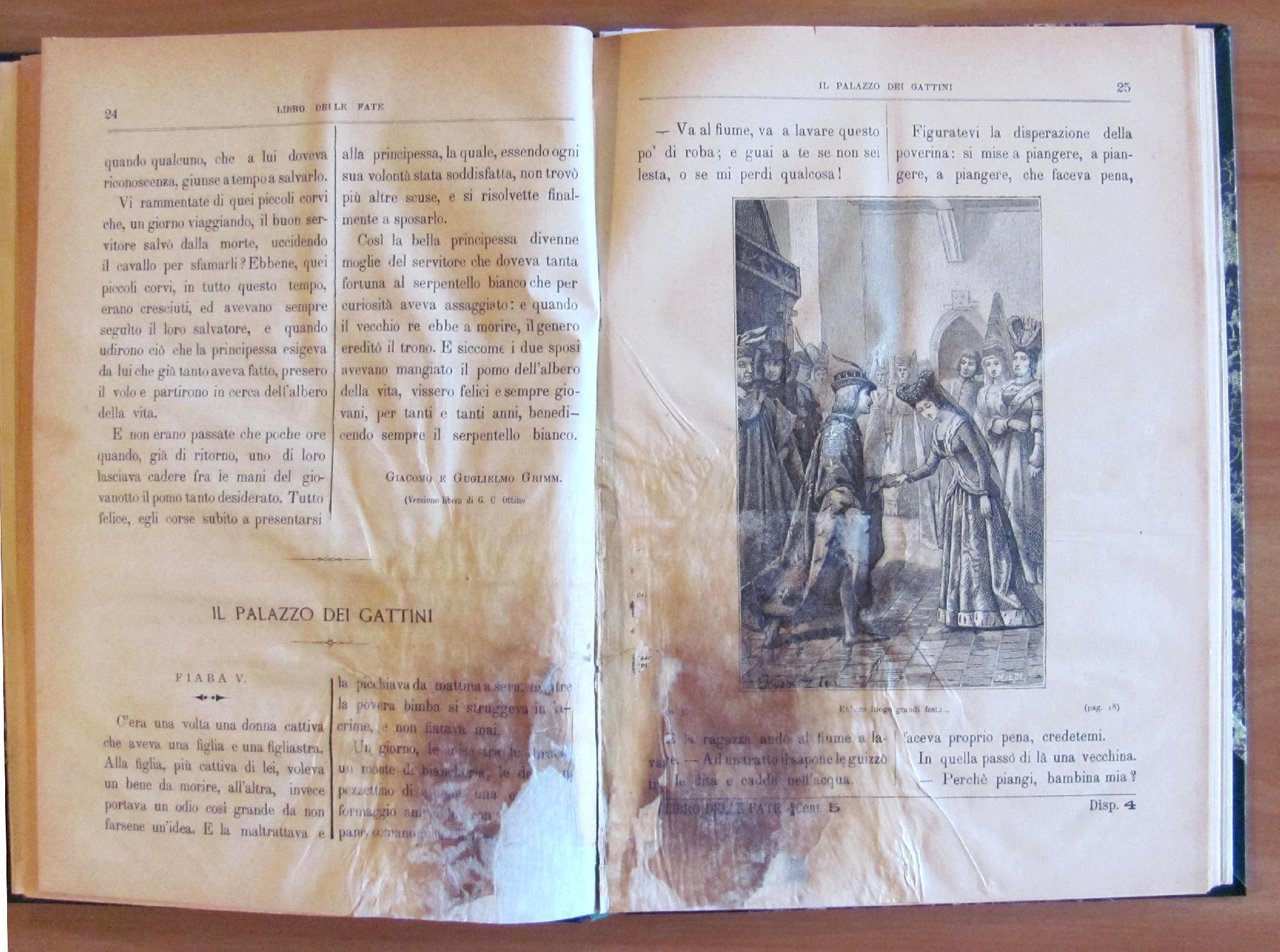Fiabe dei migliori autori italiani e stranieri - Parte I e Parte II. Frontespizio a colori al primo volume e 30 illustrazioni in b/n n.t., 20 al secondo libro tutte di artisti diversi. Editore Edoardo Perino - Roma, 1887 e 1889. I racconti contenuti sono tutti completi, in dispense, dalla 1 alla 19 al primo libro e dalla 20 alla 40 al secondo. Entrambi i volumi sono rilegati in mezza pelle con titoli in oro ai dorsi. Le pagine da 8 a 28 del primo libro presentano un restauro professionale in basso alla cerniera, particolarmente evidente dalla 18 alla 28, come se avessero subito una bruciatura causando alcune mancanze e la circostante brunitura della carta. Peraltro freschi e puliti. 21x29; pp.156 + 160. Rari e in Buono stato. , Buono (Good)