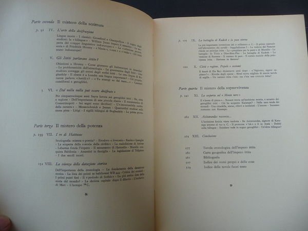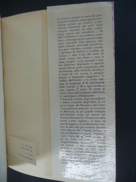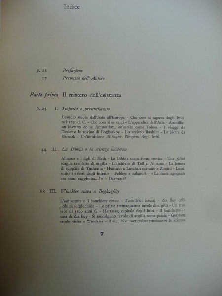DESCRIZIONE: Einaudi Torino 1956 II^ Ed., br. ed. con sovracc. ill. a col. e cop. in acetato INTEGRA, Con 24 tavole fuori testo di illustrazioni fotografiche in bianco e nero, una cartina ripiegata e 47 illustrazioni in bianco e nero nel testo pp. 320 in 8°. Indice: Prefazione; Premessa dell'Autore. Parte prima. Il mistero dell'esistenza. I. Scoperta e presentimento; II. La Bibbia e la scienza moderna; III. Winckler scava a Boghazköy. Parte seconda. Il mistero della scrittura. IV. L'arte della decifrazione; V. Gli ittiti parlavano ittito?; VI. "Dal nulla nulla può essere decifrato". Parte terza. Il mistero dell potenza. VII. I re di Hattusas; VIII. La scienza della datazione storica; IX. La battaglia di Kadesh e la pace eterna; X. Città e regione - popolo e costumi. Parte quarta. Il mistero della sopravvivenza. XI. La scoperta sul Monte nero; XII. Asitawandas racconta.; XIII. Conclusione. Tavola cronologica dell'impero ittita; Carta geografica dell'impero ittita. CONDIZIONI: Ottime/Perfette. Questo libro proviene da una importante biblioteca privata, per cui alla prima bianca sono riportati i codici di catalogazione oltre all’etichetta sul dorso. PESO / WEIGHT: 575 gr. without package