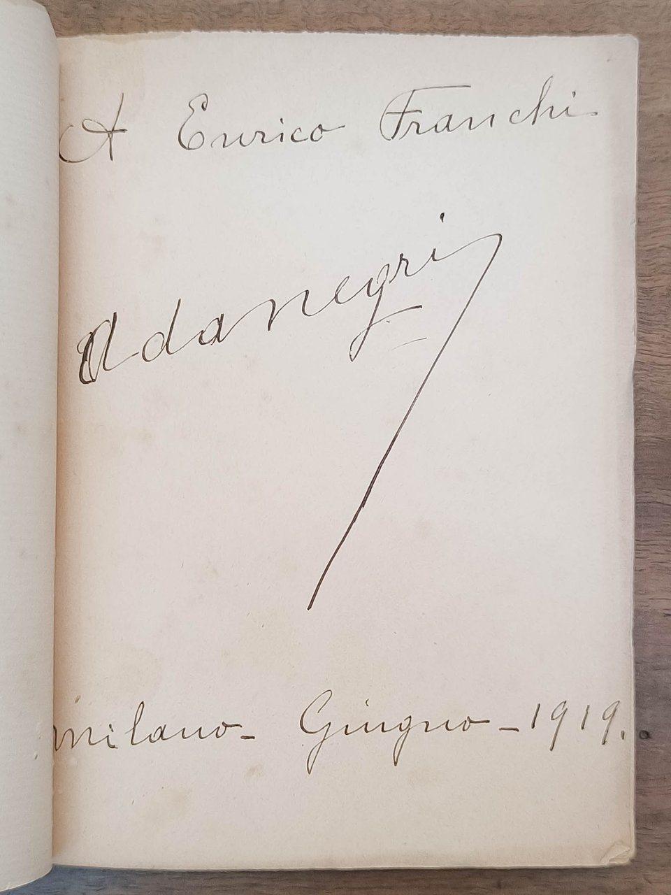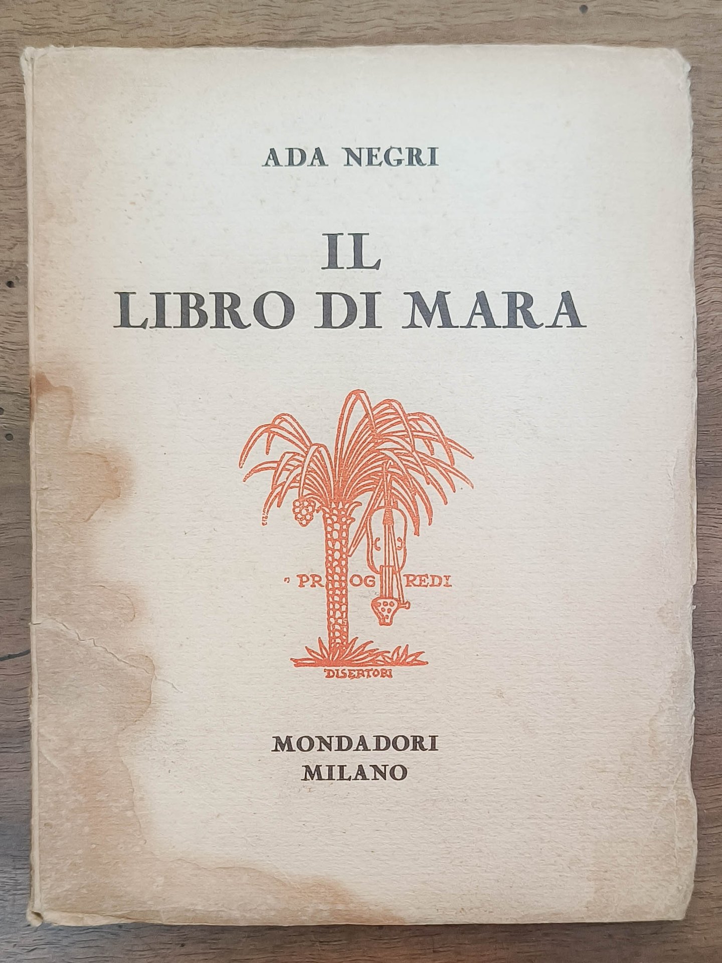Il libro di Mara, Milano, Fratelli Treves Editori, 1919. Prima edizione. Cm 21,5. Pp. 105 (1). Brossura editoriale. Segni d'usura alla legatura, copertina e prime pagine staccate. Strappi e lacune al dorso. Alla carta bianca dopo il testo applicato ritaglio di giornale con recensione del libro firmata P.F. Dedica autografa dell'autrice "A Enrico Franchi" datata Milano Giugno 1919.