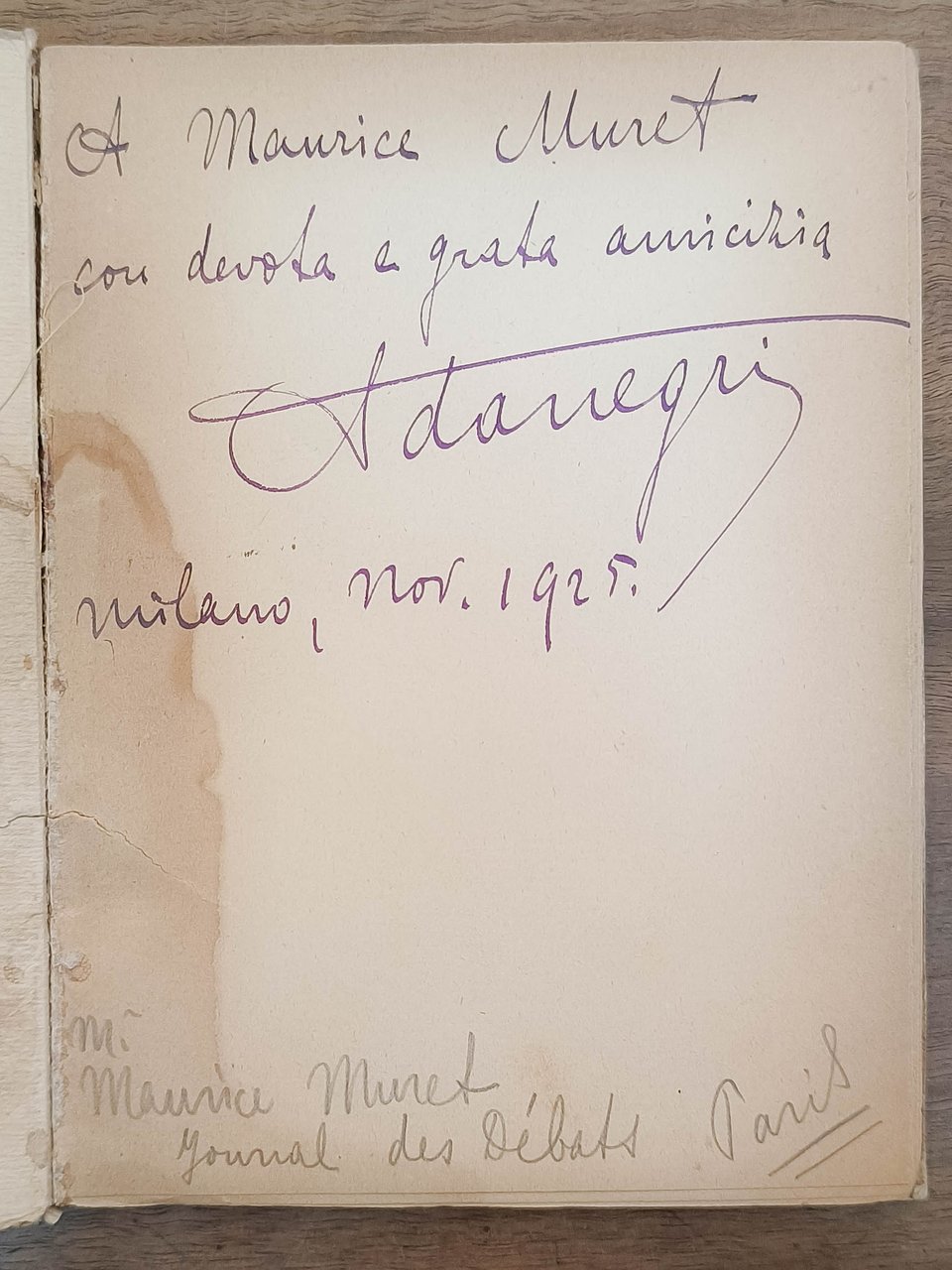 Il libro di Mara, Milano, Mondadori, 1925. Cm 20,3. Pp. 118. Brossura editoriale. Macchia d'umidità al dorso e ai piatti che intacca le pagine all'interno. Dedica autografa dell'autrice "A Maurice Muret con devota e grande amicizia Ada Negri Milano, Nov. 1925" (giornalista e redattore del Journal des Débats).