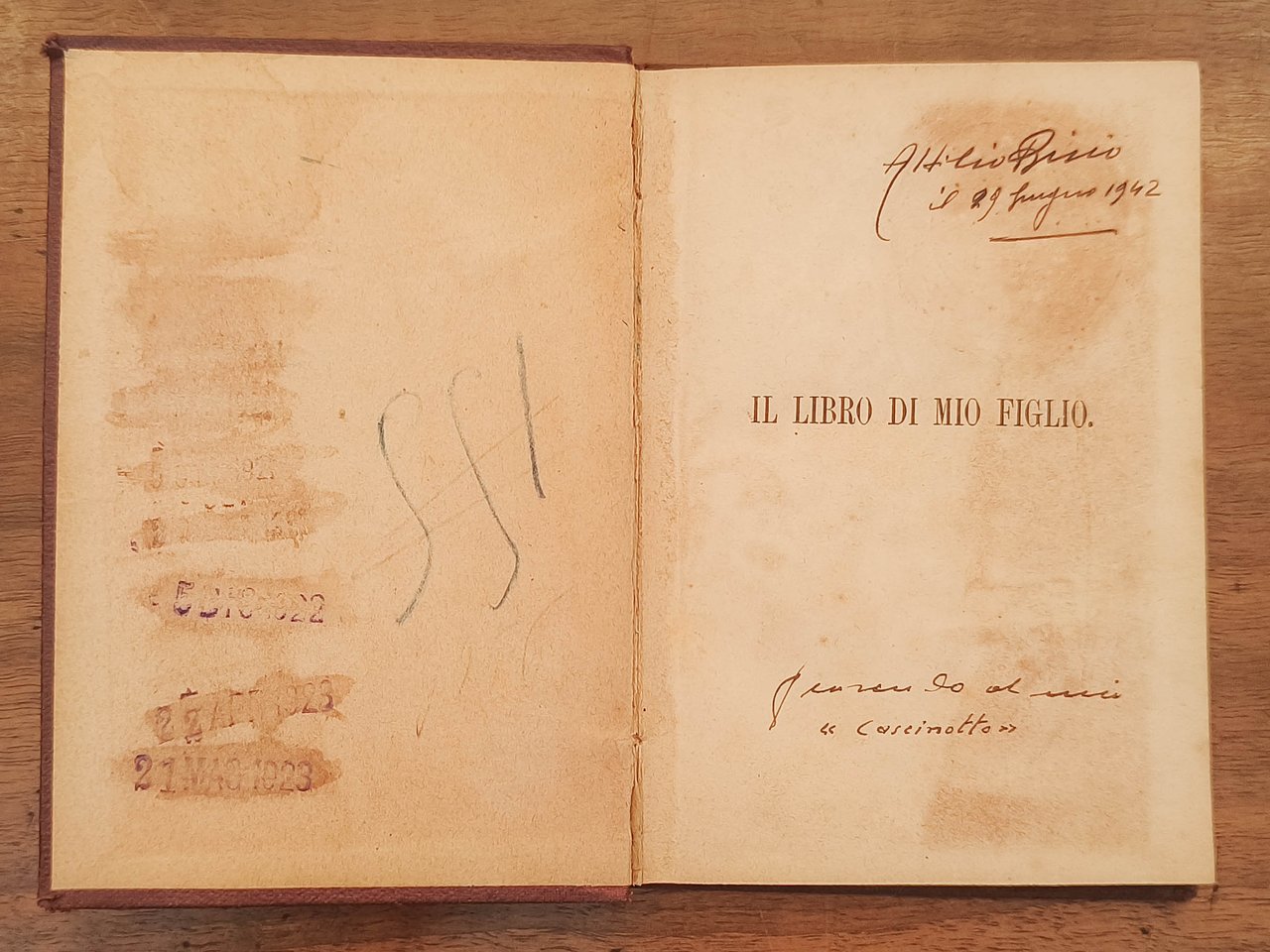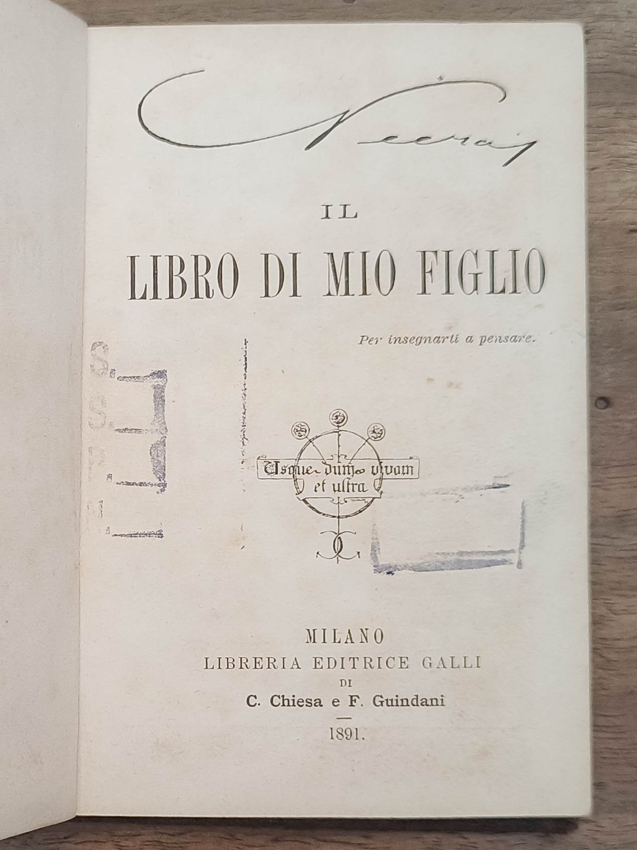 Il libro di mio figlio, Milano, Libreria Editrice Galli, 1891. Prima edizione. Cm 14,5. Pp. (4) 111 (1). Legatura in tela, al dorso autrice e titolo in oro. Timbro numerico al frontespizio. Sottolineature nel testo. Firma di appartenenza all'occhiello. Firma dell'autrice al frontespizio.