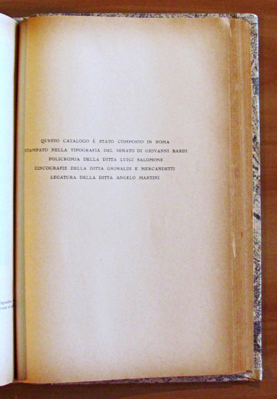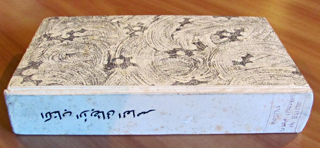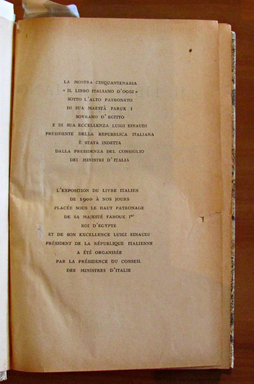 Catalogo ufficiale trilingue dell'esposizione cinquantenaria dal 1900 ai nostri giorni. Copertina originale in brossura splendidamente illustrata a colori e oro, raffigurante La Giustizia nel mosaico del Secolo XIII in Venezia, Basilica di San Marco, e molte tavole in b/n f.t. Tipografia del Senato di Giovanni Bardi - Roma, 1951. Catalogo distribuito al Cairo ed Alessandria d'Egitto con testo trilingue (italiano, francese e arabo). Rilegatura coeva cartonata con dorso in tela con titolo in arabo impresso al dorso e titolo italiano scritto a mano. 14,5x22,5; pp.816 + 198 con numerazione araba. OTTIMO STATO , Molto buono (Very Good)
