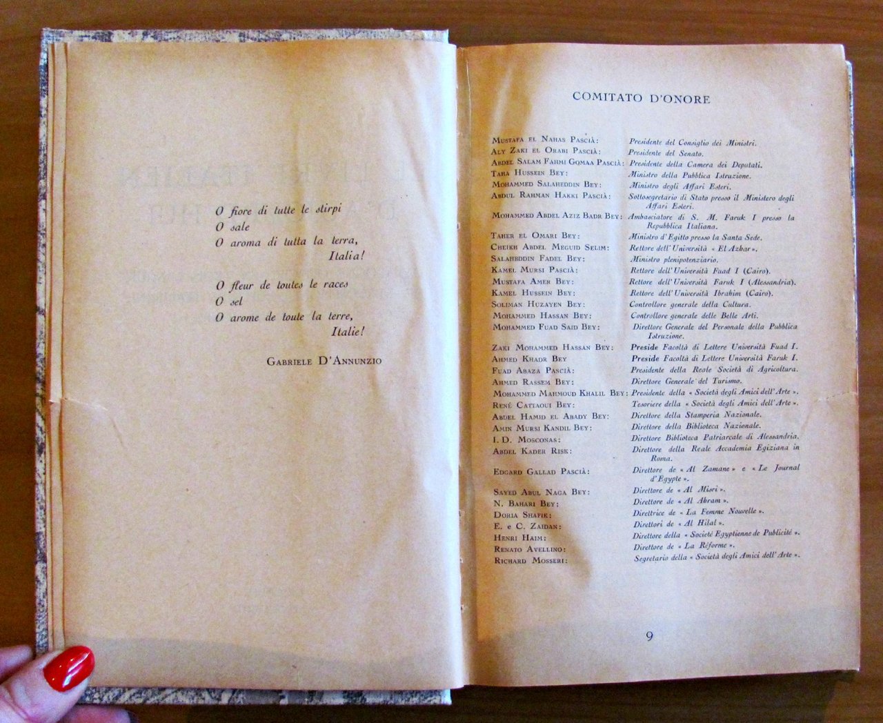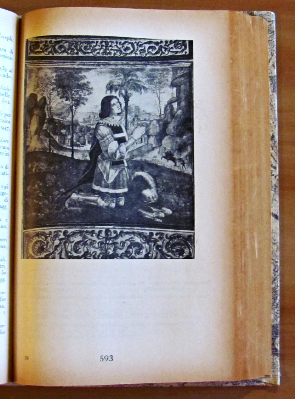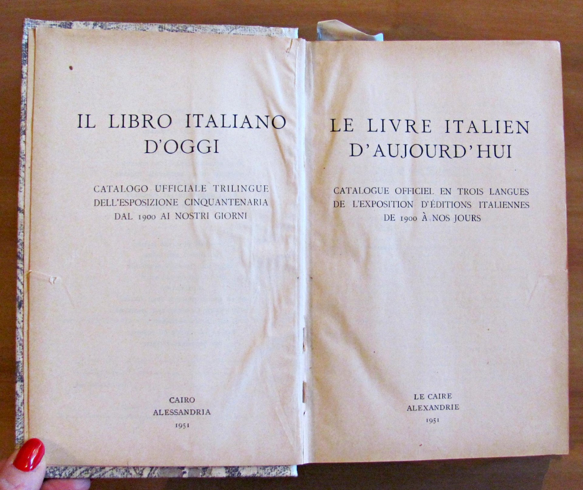 Catalogo ufficiale trilingue dell'esposizione cinquantenaria dal 1900 ai nostri giorni. Copertina originale in brossura splendidamente illustrata a colori e oro, raffigurante La Giustizia nel mosaico del Secolo XIII in Venezia, Basilica di San Marco, e molte tavole in b/n f.t. Tipografia del Senato di Giovanni Bardi - Roma, 1951. Catalogo distribuito al Cairo ed Alessandria d'Egitto con testo trilingue (italiano, francese e arabo). Rilegatura coeva cartonata con dorso in tela con titolo in arabo impresso al dorso e titolo italiano scritto a mano. 14,5x22,5; pp.816 + 198 con numerazione araba. OTTIMO STATO , Molto buono (Very Good)