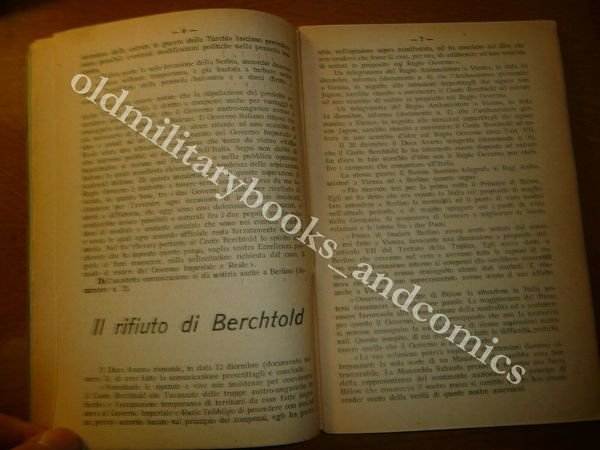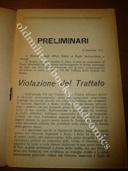 TITOLO: IL LIBRO VERDE DOCUMENTI E NOTE SULLA DENUNCIA DEL TRATTATO DI ALLEANZA FRA L'ITALIA E L'AUSTRIA-UNGHERIA DESCRIZIONE: Franceso Benetti Ed. Firenze 1915, br. ed., pp. 29 in 16°. Vol. che riporta UNA PARZIALE corrispondenza intercosa fra il Ministro degli Affari Esteri (Sonnino) e il R. Ambasciatore a Vienna (Avarna) e che riporta dei commenti dell'Autore. CONDIZIONI: Buone/Ottime. PESO / WEIGHT: 100 gr. without package