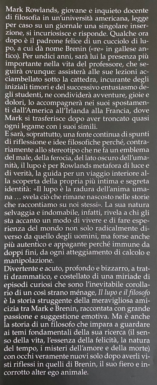 Mark Rowlands, giovane e inquieto docente di filosofia in un'università americana, legge per caso su un giornale una singolare inserzione, si incuriosisce e risponde. Qualche ora dopo è il padrone felice di un cucciolo di lupo, a cui dà nome Brenin (re in gallese antico). Per undici anni, sarà lui la presenza più importante nella vita del professore, che seguirà ovunque: assisterà alle sue lezioni acciambellato sotto la cattedra, incurante degli iniziali timori e del successivo entusiasmo degli studenti, ne condividerà avventure, gioie e dolori, lo accompagnerà nei suoi spostamenti dall'America all'Irlanda alla Francia, dove Mark si trasferisce dopo aver troncato quasi ogni legame con i suoi simili. E sarà, soprattutto, una fonte continua di spunti di riflessione e idee filosofiche perché, contrariamente allo stereotipo che ne fa un emblema del male, della ferocia, del lato oscuro dell'umanità, il lupo è per Rowlands metafora di luce e di verità, la guida per un viaggio interiore alla scoperta della propria più intima e segreta identità: Il lupo è la radura dell'anima umana, svela ciò che rimane nascosto nelle storie che raccontiamo su noi stessi. La sua natura selvaggia e indomabile, infatti, rivela a chi gli sta accanto un modo di vivere e di fare esperienza del mondo non solo radicalmente diverso da quello degli uomini, ma forse anche più autentico e appagante perché immune da doppi fini, da ogni atteggiamento di calcolo e manipolazione. Divertente e acuto, profondo e bizzarro, a tratti drammatico, e costellato di una miriade di episodi curiosi che sono l'inevitabile corollario di un così strano ménage, Il lupo e il filosofo è la storia struggente della meravigliosa amicizia tra Mark e Brenin, raccontata con grande passione e suggestione emotiva. Ma è anche la storia di un filosofo che impara a guardare ai temi fondamentali della sua ricerca (il senso della vita, l'essenza della felicità, la natura del tempo, i misteri dell'amore e della morte) con occhi veramente nuovi solo dopo averli visti riflessi in quelli di Brenin, il suo fiero e incorrotto alter ego animale.
