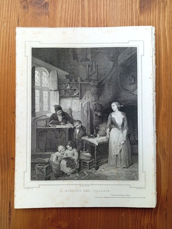 Incisione estratta dal volume "Gemme d'arti italiane - anno nono, 1856" (Milano, Venezia e Verona, coi tipi dello Stabilimento Nazionale di P. Ripamonti Carpano). Foglio di 20,5 x 27 cm circa; da un dipinto di Gerolamo Induno, su disegno di Trezzini; incisore Domenico Gandini. Il titolo presenta un refuso ("vilaggio"). Leggere fioriture perlopiù ai margini del foglio, nel complesso buon esemplare.