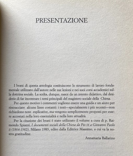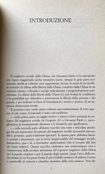 Il volume è aperto da un saggio teorico e storico-critico sullo sviluppo del magistero sociale da Gregorio XVI a Giovanni Paolo II, raccogliendone la fondamentale direzione e le tematiche più significative; segue una antologia dei più importanti documenti del magistero sociale della Chiesa. Tale raccolta costituisce una testimonianza della secolare attenzione della Chiesa per il popolo cristiano e per il popolo degli uomini, lungo l'arco della storia umana in cui ha preso forma il tentativo di ridurre l'uomo a "particella di materia o cittadino anonimo della città umana".