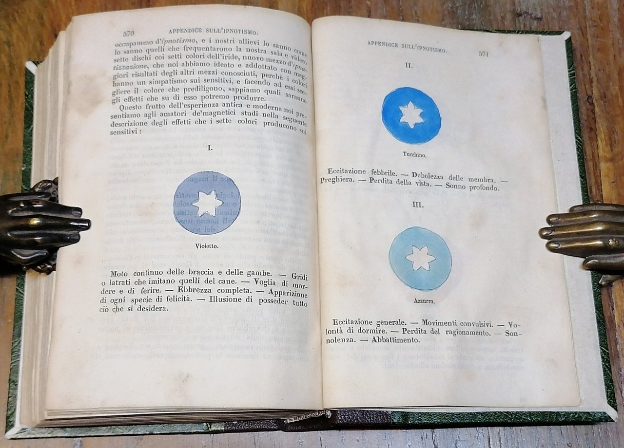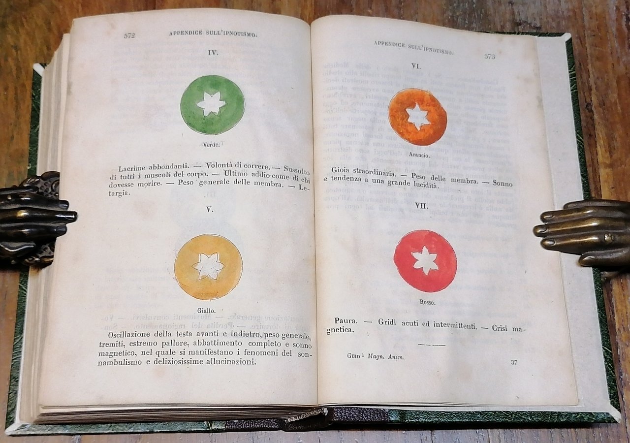 (Magnetismo; Mesmerismo; Fenomenologia magnetica; Chiaroveggenza; Ipnotismo; Sonnambulismo magnetico) In 16° grande, legatura moderna in mezza pelle ocra scuro con titoli ed impressioni in oro al dorso, pp. 577,(6), con 14 tavole litografiche fuori testo tra cui un ritratto dell'autore in antiporta, 29 illustrazioni xilografiche nel testo compresa la vignetta al frontespizio con il "Doppio triangolo magnetico" e le 7 figure colorate con i colori dell'iride (descrizione degli effetti che i sette colori producono sui sensitivi). Ottimo stato di conservazione.