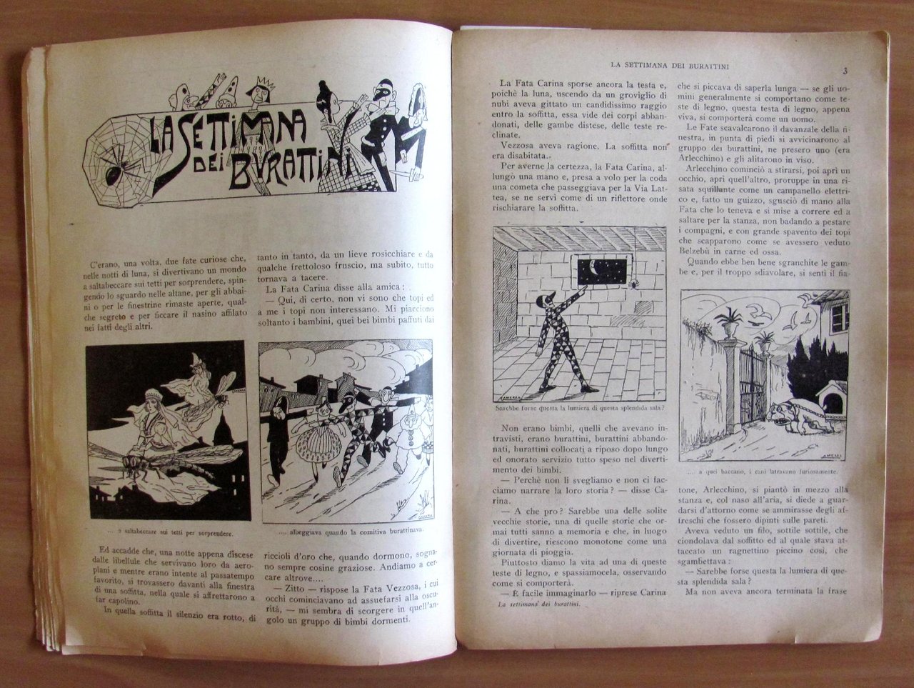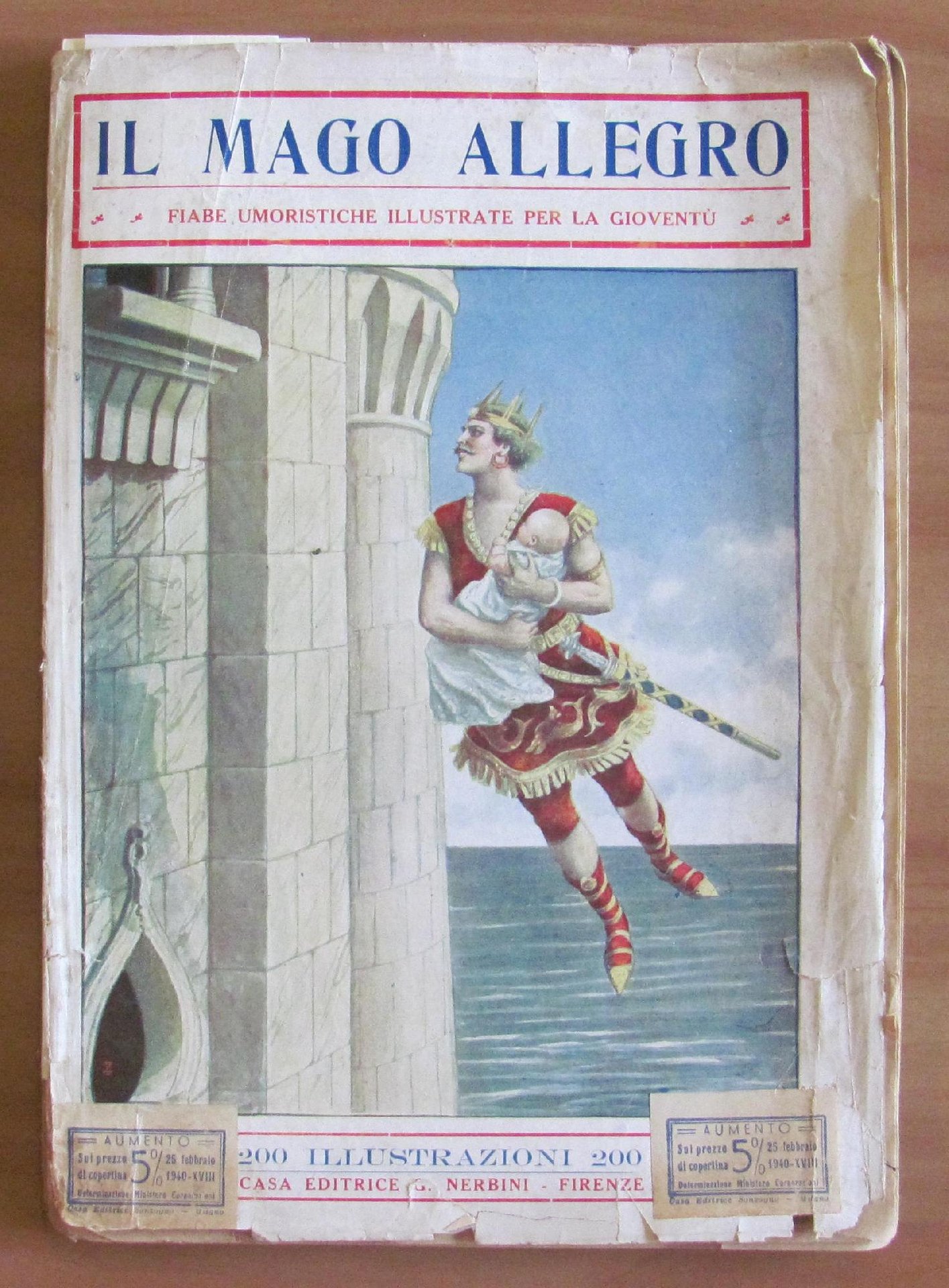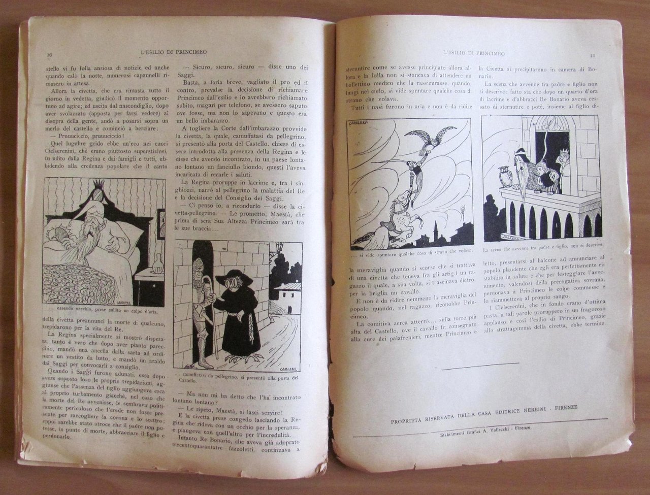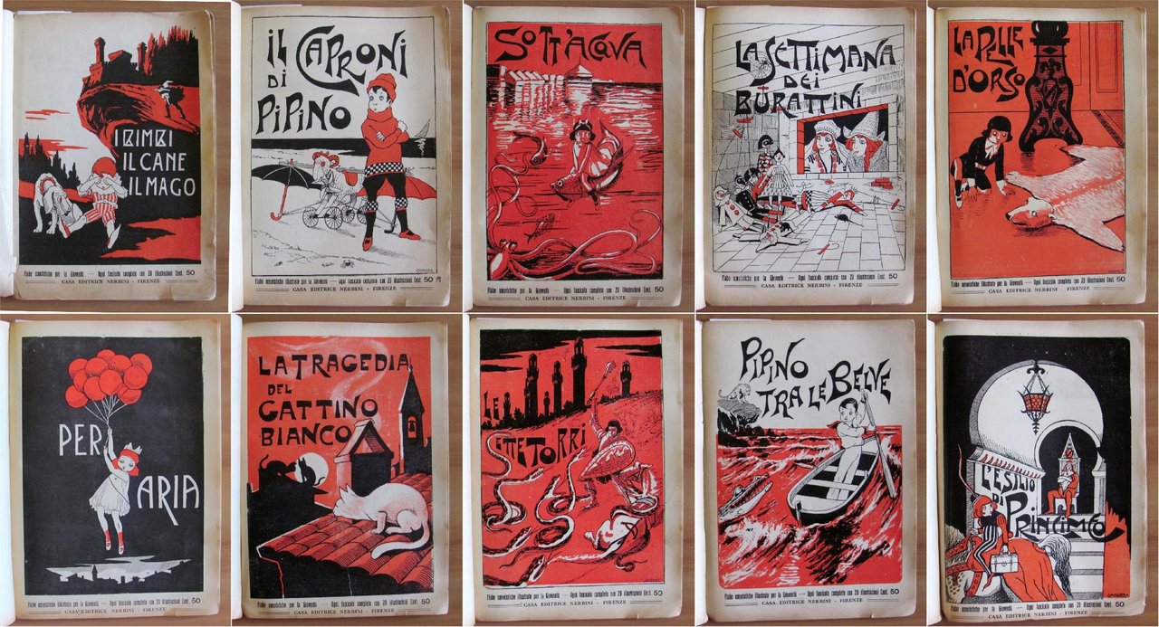 Fiabe Umoristiche per la Gioventù - Raccolta di 10 Fiabe. Belle copertine in tricromia per ciascuna fiaba e molte illustrazioni in b/n n.t. ad ogni fascicolo di Camerra. Casa Editrice Nerbini - Firenze, 1940. Copertina editoriale, solo anteriore, edita per la raccolta delle Fiabe con imperfezioni ai margini esterni. I 10 Fascicoli raccolti insieme sono tutto Ottimi e Intonsi. 19,5x27; pag 12 per ciascun fascicolo. Raro e in Buonissimo stato.
