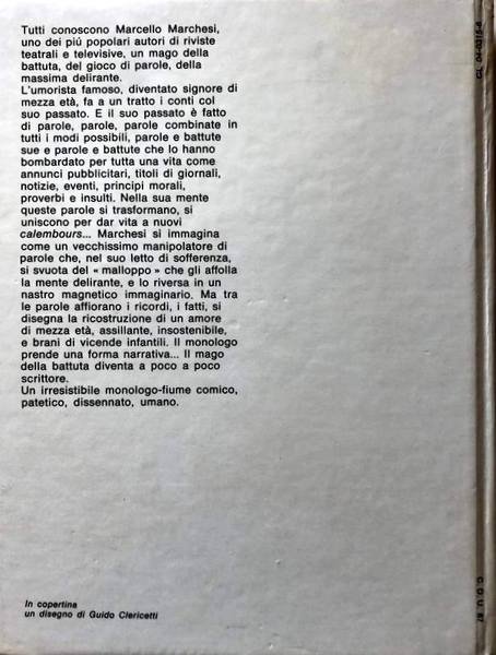 Marcello Marchesi è stato uno dei più popolari autori di teatro e televisione, un mago della battuta, del gioco di parole, della massima delirante. Nel "Malloppo" l'umorista famoso, diventato signore di mezza età, fa i conti col suo passato. E il suo passato è fatto di parole, parole, parole combinate in tutti i modi possibili, parole e battute sue e parole e battute che lo hanno bombardato per tutta una vita come annunci pubblicitari, titoli di giornali, notizie, eventi, principi morali, proverbi e insulti. Nella sua mente queste parole si trasformano, si uniscono per dar vita a nuovi calembour. Marchesi si immagina come un vecchissimo manipolatore di parole che, nel suo letto di sofferenza, si svuota del "malloppo" che gli affolla la mente delirante, e lo riversa in un nastro magnetico immaginario. Ma tra le parole affiorano i ricordi, i fatti, si disegna la ricostruzione di un amore di mezza età, assillante, insostenibile, e brani di vicende infantili. Il monologo prende una forma narrativa. Il mago della battuta diventa a poco a poco scrittore. Un irresistibile monologo-fiume comico, patetico, dissennato, umano. “Ho fatto l’amore dappertutto meno che in una cabina elettorale. Là ho preso solo delle fregature.".