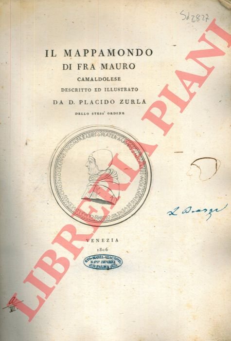 Venezia, 1806, in-folio (cm. 37 x 26) brossura coeva d'attesa con titoli manoscritti al dorso, pp. 164, grande calcografia circolare al frontespizio con ritratto a mezzo busto di Fra Mauro e, in fine, una grande tavola ripiegata “Abbozzo del Mappamondo di fra Mauro” (cm. 42 x 46) e una tavola calcografica a piena pagina (“Saggio di caratteri e disegni del Mappamondo di Fra Mauro”). Si tratta della prima discussione e pubblicazione della Mappa mundi di Fra Mauro (1450), la summa della cartografia medievale e, storicamente parlando, una dei più importanti planisferi mai realizzati. Zurla ebbe accesso all'originale (conservato nella Biblioteca di S. Michele di Murano a Venezia) per realizzare questa bella edizione. Difetti alla brossura (strappi e mancanze riparati al dorso); all'interno molto buono, con solo lievissime e sporadiche fioriture. Copia in barbe, con margini amplissimi.