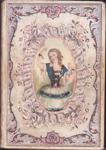 In 24°, pp. 2 nn., 191, 1 b., 5, 3. Grazioso libro strenna per signora, leg. edit. bianca con ghirlande di rose e nastri al ds. e ai piatti., ritratto di fanciulla al centro del piatto ant., tagli dorati, front. calligrafico; con 3 inc. f.t.; qc. fior. 515/27 bis
