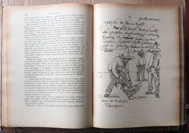 Mondadori, Dicembre 1945. Prima edizione. In 8vo grande, pp. 653 (con Indici), con 38 disegni in b/n n. t., bross. edit. in carta disegnata a entrambi i piatti. Libro scorrevole e di piacevolissima lettura, assai interessante per lineare descrizione delle aree del continente americano. sotto Bella e coeva dedica alla prima bianca, datata 1947. Molto buono lo stato di conservazione.