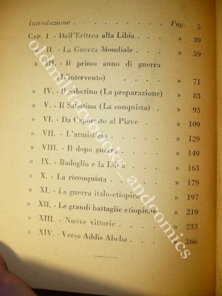 DESCRIZIONE: Aurora Ed. Milano 1936 br. ed. ill. pp. 287 num. ill. seppia f.t. in 16°. Con una introduzione di Gian Dauli. DallEritrea alla Libia; La Guerra Mondiale; Il primo anno di guerra: l'intervento; Il Sabotino: la preparazione, la conquista; Da Caporetto al Piave; L'armistizio; Il dopo guerra; Badoglio e la Libia; La riconquista; La guerra italo-etiopica; Le grandi battaglie etiopiche; Nuove vittorie; Verso Addis Abeba: l'entrata trionfale. CONDIZIONI: Buone cop. con piccola abrasione e strappetto. PESO / WEIGHT: 300 gr. without package