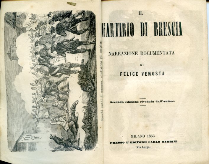 In-16°, pp. 157, (3), brossura muta gialla. Antiporta figurata incisa in xilografia. Dedicatoria alla memoria di Francesco Nullo. Bell'esemplare. Seconda edizione. Il Venosta (Napoli, 1888-ivi,1889) prese parte alle Cinque Giornate di Milano e poi alla Guerra d'Indipendenza, militando nella Divisione lombarda. In seguito, si fece attivo pubblicista e autore di divulgative biografie dei principali protagonisti del Risorgimento edite dal Barbini nella collana, di cui fa parte anche il presente volume, del 'Pantheon dei Martiri della Libertà italiana'.