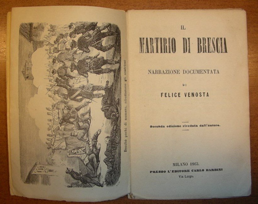 in-16, pp. 157, bross. edit. con cop. fig. Con alcune xilogr. p. pag. Da pag. 101 a pag. 109 elenco nominativo dei 137 martiri bresciani. Rottura al d., per il resto ottimo esempl. [048]