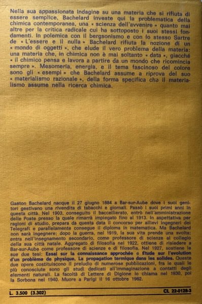 L'epistemologia, la riflessione della scienza su se stessa e sui propri metodi, ha trovato in Gaston Bachelard uno dei più sottili indagatori del nostro secolo. Qui il suo sguardo analitico si posa sullo statuto scientifico della chimica contemporanea per individuare - contro le semplificazioni dell'idealismo e di un positivismo chiuso nell'empiria - la strada maestra di un «materialismo razionale», in grado di affrontare la complessità del reale. Il processo della conoscenza scientifica è studiato nel suo continuo crescere e variare sulla base di nuovi dati e nuove sintesi, sempre - sottolinea Bachelard - provvisorie, poiché il nostro sapere - come del resto il mondo stesso - è in continua trasformazione, in perenne movimento.
