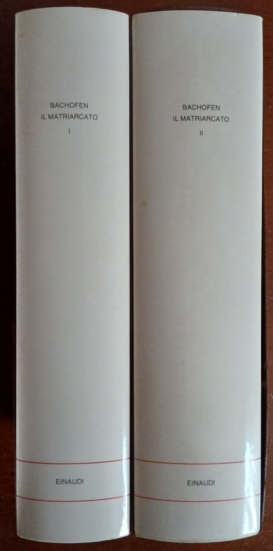 Due volumi in 8°, legatura in piena tela editoriale con sovraccoperte illustrate a colori, custodie mute in cartoncino marrone, tagli di testa colorati, nastri segnalibro. Collana "I millenni". Edizione italiana del "Mutterrecht" (1861) a cura di Giulio Schiavoni, con un saggio introduttivo di Furio Jesi. Tomo primo : traduzione di Furio Jesi e Giulio Schiavoni, pp. LXXIV,522, con 1 tavola in antiporta e 29 a colori fuori testo. Tomo secondo : traduzione di Giulio Schiavoni, pp. XVI,523-1210, con 1 tavola in antiporta e 23 a colori fuori testo. Ottimo stato di conservazione.
