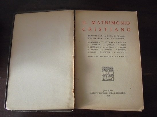 MILANO, VITA E PENSIERO, 1931. In 16∞: pp. IX + 257. Br. edit. cart. guasta. Bruniture. Scritti vari a commento dell`Enciclica "Casti Connubii". A. Gemelli, V. Lattanzi, E. Caronti, G. Soranzo, C. Jaspar, ecc. Preceduti dall`Enciclica di Pio S.S. Pio XI.