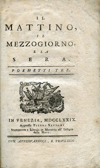 3 parti in numerazione continua e con autonomo occhietto in un vol. in-8° (198x119mm), pp. 120, brossura posteriore con titolo manoscritto su tassello cartaceo. Vignetta xilografica al titolo con figure di navigli. In barbe, con consuete fioriture, in buono stato. Non comune edizione veneziana delle prime tre parti del 'Giorno' pariniano, capolavoro indiscusso della poesia didascalica italiana (il nome dell'autore non compare). Il 'Mattino' era stato pubblicato nel 1763, il 'Mezzogiorno' nel 1765. La 'Sera' apparve solo successivamente con il titolo 'Il Vespro', mentre l'ultima parte, la 'Notte', sarà edita postuma solo nel 1801 dall'editore delle opere del Parini, Francesco Reina. Manca al Bustico che, n. 41, cita solo l'edizione del Savioni di cinque anni prima.