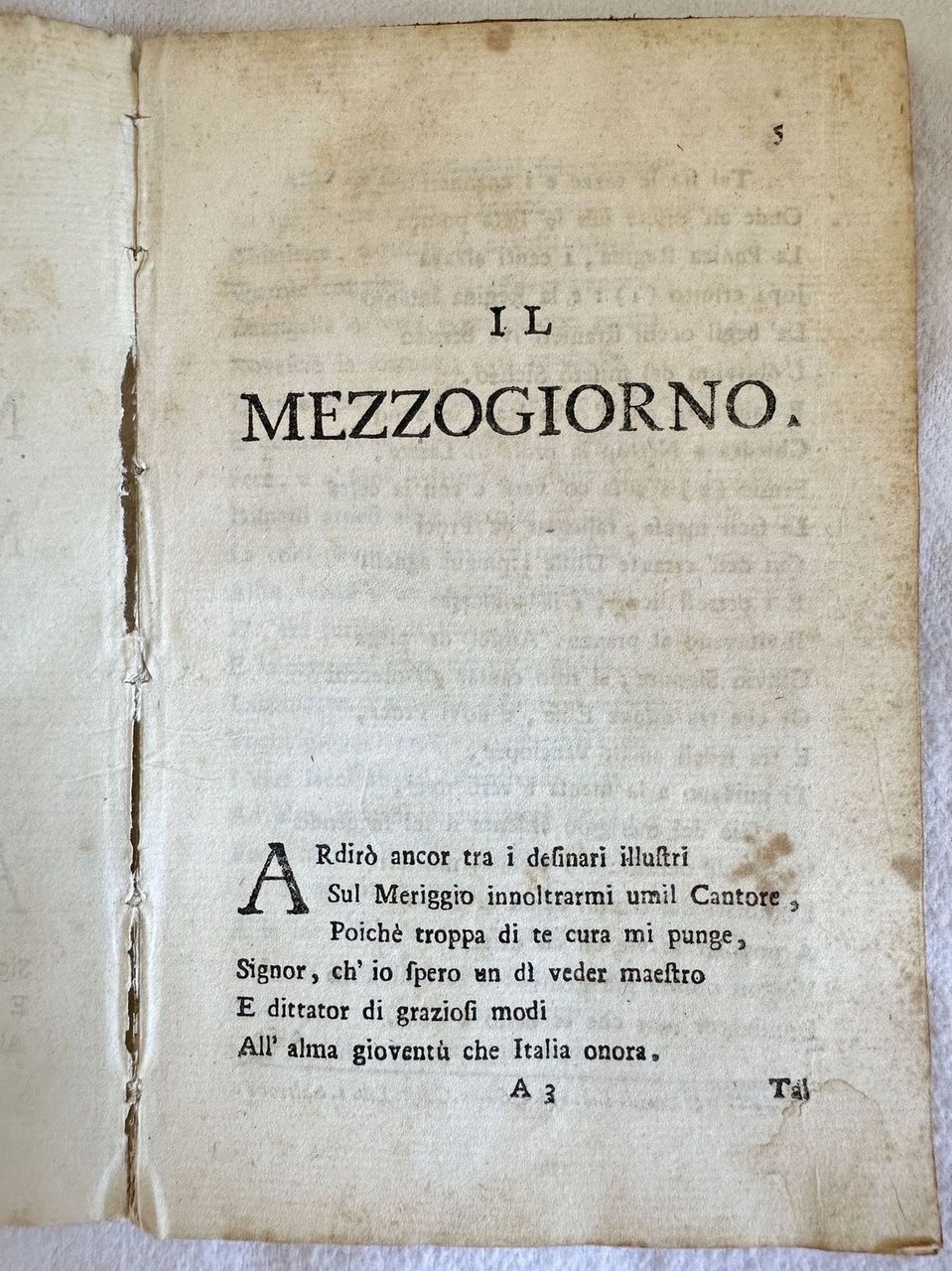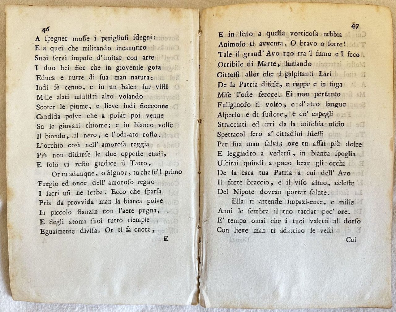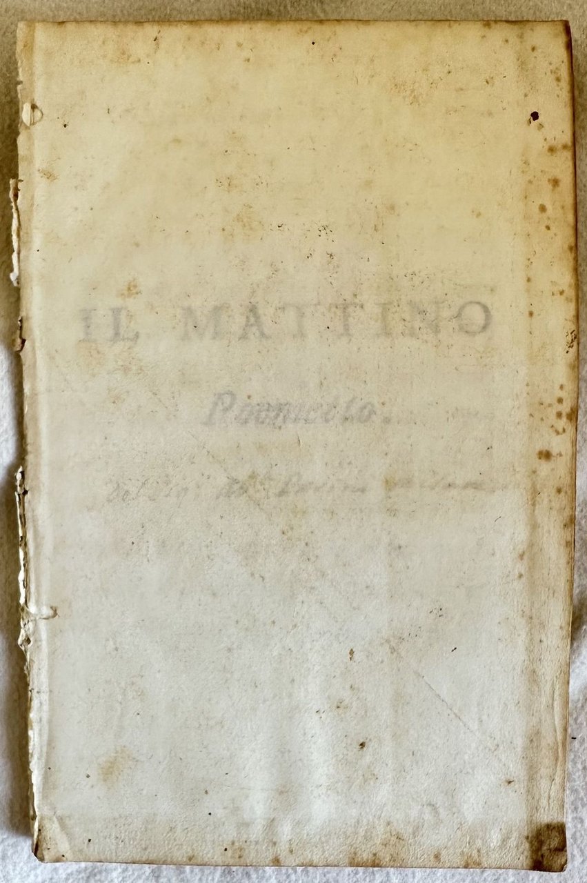 Due rarissime edizioni del poemetto didascalico satirico "Il giorno" del poeta e abate milanese Giuseppe Parini (1729-1799). Membro dell'Accademia dei Trasformati fu uno dei massimi esponenti dell'Illuminismo e del neoclassicismo in Italia Parini spinto dall'Accademia nel 1793 decise di pubblicare in forma anonima il poemetto "Il Mattino" (era disdicevole che un Abate si occupasse di questioni non religiose). L'opera venne accolta molto favorevolmente dalla critica e decretò l'inizio del suo successo. Due anni più tardi nel 1795 vide la luce la seconda parte del poema "Il Mezzogiorno". La terza parte "Sera" venne divisa in due parti ma rimaste incompiute e venne pubblicata postuma nel 1801 in una edizione collettiva. Questa edizione de "Il Mattino" è la seconda, pubblicata lo stesso anno della prima.? Il titolo è indicato all'occhietto e i dati editoriali nell'ultima carta. Nota manoscritta alla pagina di titolo "del Sig. Ab. Parini milanese". ? "Il Mezzogiorno" è invece in prima edizione. Due sono le tirature dello stesso anno con alcune varianti tipografiche come l'Imprimatur a pag. 64 che è su nove righe (come il nostro) oppure su otto. Il titolo è indicato all'occhietto e i dati editoriali nell'ultima carta.? In ottime condizioni.? Copertina assente. Legatura in buone condizioni. Pagine in buone condizioni con fioriture. In 16. cm. 17,5x11,5. Pp. 63, 64. Two very scarce editions of "Il giorno" little poem by the poet and abate from Milan Giuseppe Parini (1729-1799).? Member of Accademia dei Trasformati was one of the most important exponent of Illuminismo and neoclassicismo in Italy. Parini in 1793 published anonymously the little poem "Il Mattino" (it was not proper that an abte occupied of non religious issues). The opera was really appreciated by critics and Parini began his success. Two years later in 1795 he published the second part fo the poem "Il Mezzogiorno". The third part "Sera" was divided into two parts but unfinished and was published posthumous in a collective edition.? This edition of "Il Mattino" is the second one, published the same year of the first one.The title is indicated in the false title page and the editorial data in the last page.? Handwritten note in the title page "del Sig. Ab. Parini milanese". "Il Mezzogiorno" is here in first edition.There are two versions in the same year with some typographical variations as Imprimatur in pag. 64 printed in nine lines (as our copy) or on eight lines.? The title is indicated in the false title page and the editorial data in the last page. In very good conditions.? Cover lacks. Binding in good conditions. Pages in good conditions with foxing. In 16. cm. 17,5x11,5. Pp. 63, 64.