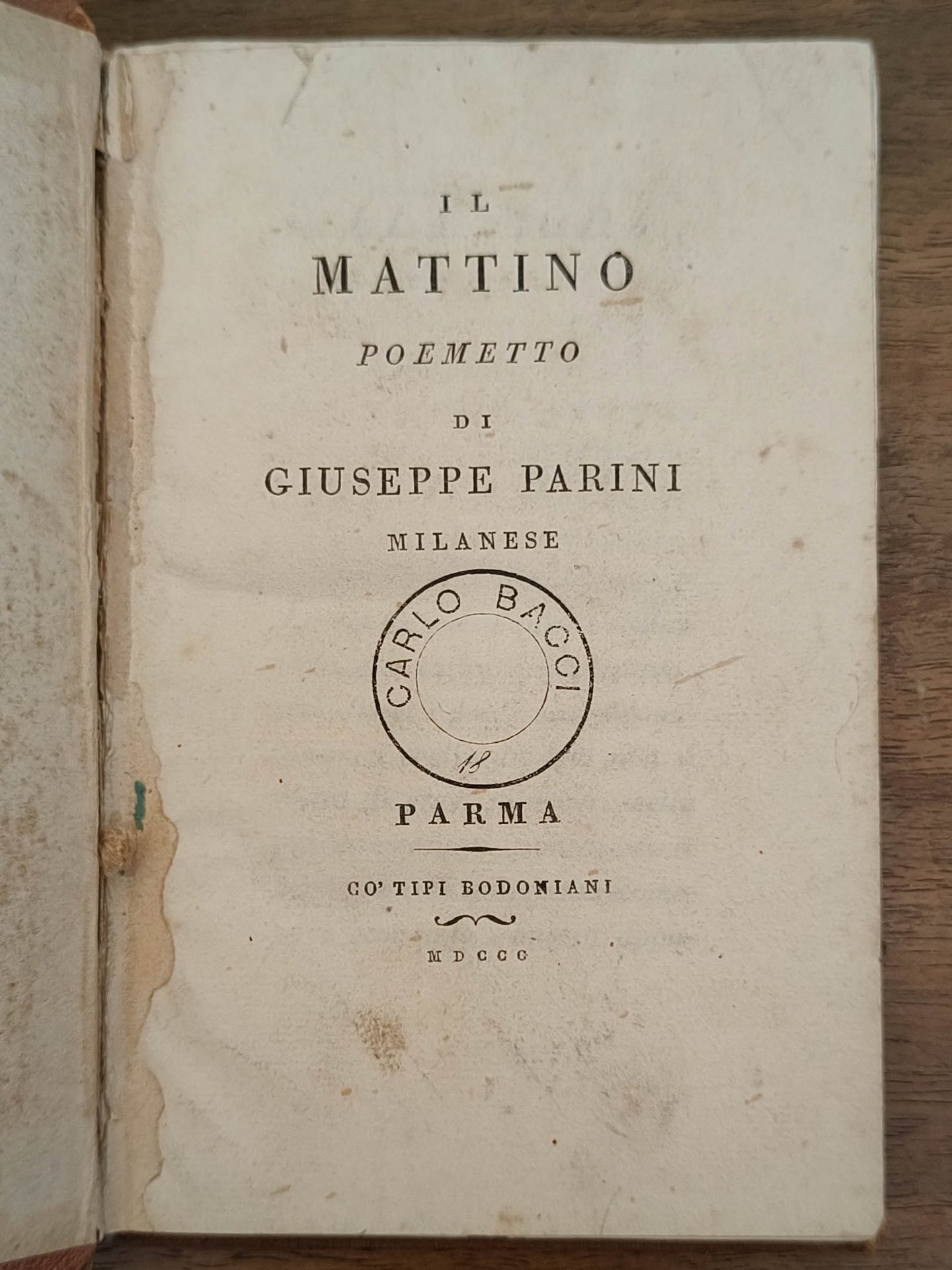 IL MATTINO poemetto di Giuseppe Parini milanese, legato con IL MEZZOGIORNO, Parma, co' tipi bodoniani, 1800. Cm 15,6. Pp. 8 48 64. Legatura rigida in percallina marrone con titolo in oro al dorso. Ottimo esemplare interno, legatura staccata. Al titolo timbro tondo: Carlo Bacci.