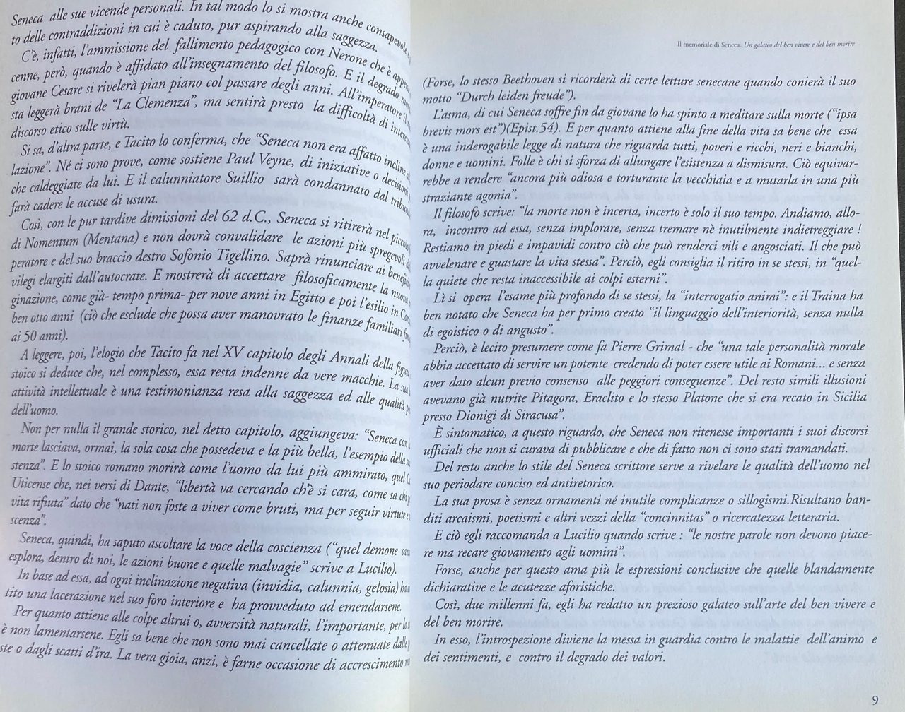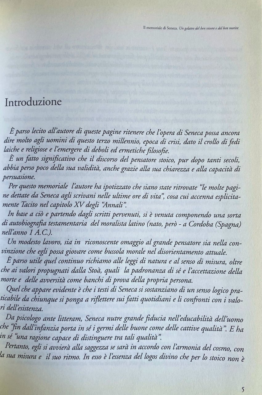 Soggetti: Opera Seneca Filosofia greca Cultura classica Galateo Discorso Stoicismo Persuasione Retorica Oratoria Memoriale Scrivani Tacito Annali Scritti Autobiografia testamentaria Moralisti latini Morale Misura Equilibrio Stoà Accettazione Morte Avversità Esistenza Pedagogia Educabilità Infanzia Qualità Saggezza Armonia Cosmo Ritmo Logos divino Stoici Buone maniere Attualità Umanistica Libri autografati Collezionismo Dediche autografe Saggi storici Natura Divinità Virtù Metafisica Passioni Usanze sconvenienti Malattie Volontà Terapia Psicanalisi Rimedi Alienazione Vizi Desideri Eclettismo Teorie epicuree Epicureismo Piacere Sette Sapienti Ubriachezza Sensi Invidia Oro Istinti Impulsi Trasgressione Giovinezza Responsabilità Sentimenti Amicizia Dottrina Universo Principi Destino Beatitudine Kant Legge Coscienza Pietas Dolore Esilio Consolazioni Tolleranza Male Libertà Indipendenza Follia Corruzione Nerone Clemenza Paul Veyne Suillio Usura Nomentum Mentana Sofonio Tigellino Ipsa brevis mors est Vita Traina Interiorità Pierre Grimal Romani Pitagora Eraclito Platone Tirannide Tirannia Autocrazia Democrazia Politica Concinnitas Ricercatezza letteraria Lucilio Aforismi Pensiero Tragedie Etica Mezzi Fini Schiavitù Gerolamo Biblioteca Laurenziana Manoscritti antichi Sant'Agostino Epistolario Ivano Dionigi Lucio Villari Fortezza Prudenza Giustizia Epistola CXX Concetto Marchesi Anneo Lucius Annaeus Animali Anima Aristone Azioni Caligola Callistene Catone Cicerone Cleante Colpa Crisippo Dèi Eneide Epicuro Felicità Fortuna Forza Georgiche Gioia Guerra Insegnamenti Lode Panezio Piaceri Posidonio Povertà Precetti Publilio Siro Ragione Ricchezza Schiavi Sénèque Socrate Sopportare Sozione Spirito Stammi Tormenti Usener Vecchiaia Virgilio Agrippina Aristotele Attalo Brevitate vitae Cattive abitudini Consigli Corsica Dione Cassio Fanciulli Giove Helviam Educazione Lattanzio Leggere Lettera Livilla Massime Messalina Moderazione Polibio Pratica Quintiliano Svetonio Comportamento Ira Ingiurie Rabbia Conosci te stesso Adirarsi Belve Bile Cartagine Delitti Democrito Disprezzo Gaio Cesare Gladiatori Lisimaco Magnanimità Nemico Numanzia Offendere Offese Serenità Silla Vendetta Vergogna Abbagnano Pohlenz Paratore Waltz Works Greek philosophy Classical culture Etiquette Speech Stoicism Persuasion Rhetoric Oratory Memorial Tacitus Annals Writings Testamentary autobiography Latin moralists Measure Balance Stoa Acceptance Death Adversity Existence Pedagogy Educability Childhood Wisdom Harmony Stoics Good manners Current affairs Humanities Autographed books Collecting Autograph dedications Historical essays Nature Divinity Virtue Metaphysics Passions Diseases Will Therapy Psychoanalysis Remedies Alienation Vices Desires Eclecticism Epicureanism Pleasure Drunkenness Senses Envy Instincts Impulses Transgression Youth Responsibility Feelings Friendship Doctrine Universe Principles Destiny Bliss Law Conscience Pain Exile Consolations Tolerance Evil Freedom Independence Madness Corruption Nero Usury Sophonius Tigellinus Romans Pythagoras Heraclitus Plato Tyranny Autocracy Democracy Politics Lucilius Aphorisms Thought Tragedies Ethics Goals Slavery Jerome Ancient manuscripts Saint Augustine Letters Justice Epistle Soul Actions Caligula Callisthenes Cato Cicero Guilt Chrysippus Gods Aeneid Epicurus Happiness Fortune Strength Georgics Joy War Teachings Praise Panaetius Pleasures Posidonius Poverty Precepts Publilius Syrus Reason Wealth Slaves Socrates Spirit Old age Virgil Aristotle Attalus Bad habits Advice Cassius Children Jupiter Education Lactantius Reading Letter Maxims Moderation Polybius Practice Quintilian Suetonius Behavior Anger Rage Know thyself Getting angry Beasts Carthage Crimes Democritus Contempt Gaius Caesar Gladiators Lysimachus Magnanimity Enemy Numantia Offending Offences Serenity Sulla Revenge Shame