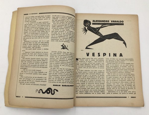 La novella occupa 5 pagine con una testata figurata del fascicolo in-8° (cm. 24x18,3), che è integro nella suaseducente brossura editoriale illustrata a COLORI (penna di pavone) e che contiene inoltre novelle di Alessandro VARALDO (Vespina), Carlo De Flaviis, Leo Bertolelli D'Auro, Silvio Giovannetti, Vittorio Guerriero,Pierre Weber, Claude Gevel, Catulle MENDèS, con 9 belle TESTATE figurate con gusto Déco in bianco e nero, una poesia pubblicitariia. per CIRIO, con bel disegno, pubblicità del cioccolato Venchi di GALA, Unica. Fiat, un aneddoto piccante su Anton Giulio BRAGAGLIA, tantissime minuscole figurette inframrmezzate ai paragrafi ecc.