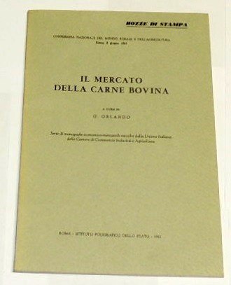 Il mercato della carne bovina, a cura di Giuseppe Orlando, Istituto Poligrafico dello Stato, Roma 1961, pp. 71, cm 25, br. ed. In altro sulla copertina: Conferenza Nazionale del Mondo Rurale e dell'Agricoltura – Roma, 8 giugno 1961. Collana Serie di monografie economico-mercantili raccolte dalla Unione Italiana delle Camere di Commercio Industria e Agricoltura. Dicitura 'bozza di stampa' stampata al margine superiore della copertina e del frontespizio. Raro.