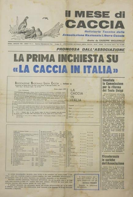 Diretto da Giuseppe Migliorelli. Roma, Maggio 1968, anno V, numero 5, Associazione Nazionale Libera Caccia. Contiene la prima inchiesta su “La caccia in Italia”. Stralcio in formato grande(cm 29 x 42) composto di pp. 12 di cui 8 sono tavole di uccelli con nome scientifico e volgare, breve didascalia di habitat, abitudini e identificazione. Buona conservazione.