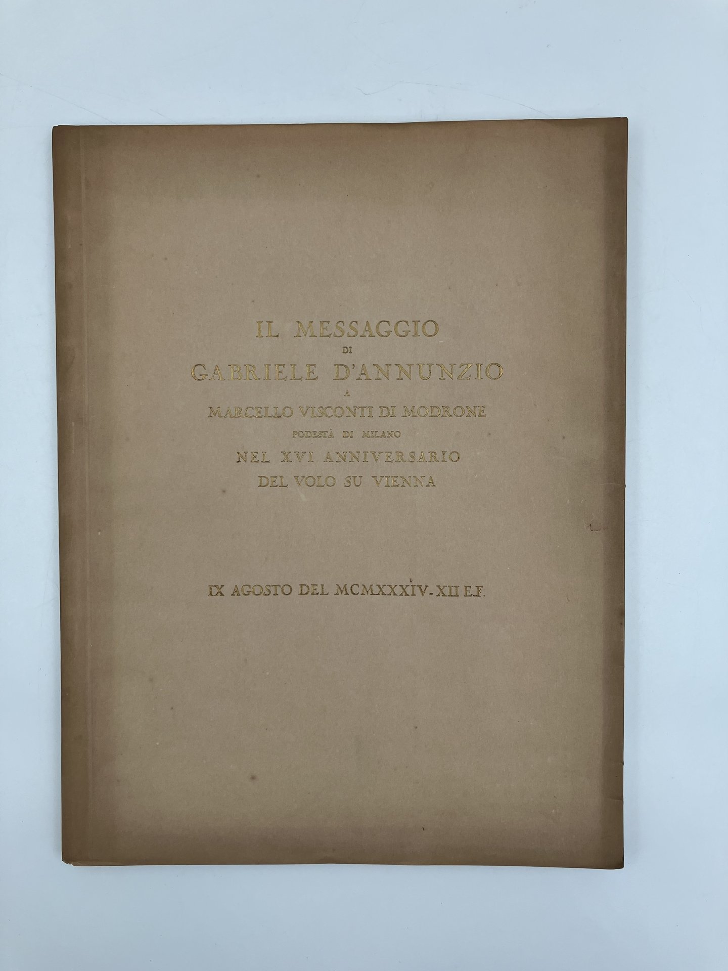 Il messaggio di Gabriele d’Annunzio a Marcello Visconti di Modrone, podestà di Milano nel XVI anniversario del volo su Vienna. IX agosto del MCMXXXIV-XII E.F.1934.