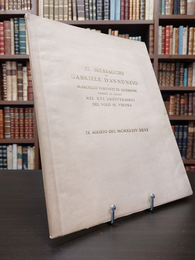 In-4° (cm. 32,5), brossura editoriale a risvolti con titolo in oro al piatto anteriore (velina protettiva); pp. [6] 27 [4] non numerate, in ottimo stato. Opera illustrata con numerose tavole in nero fuori testo e stampata in facsimile di autografo. Esemplare n. 484 su carta velina. «Tra i messaggi dannunziani questo è il più ricco per il contenuto delle documentazioni e per la veste editoriale» [Guabello 361]. Volume intonso. Ottimo esemplare. (NX)
