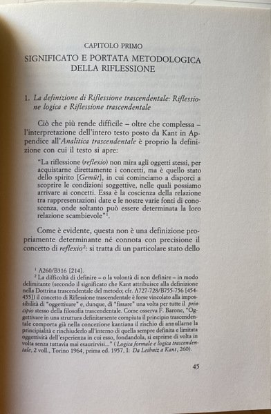 Si tratta di una definizione complessa che si artico la innanzitutto attraverso la distinzione di Riflessione logica e Riflessione trascendentale e, in secondo luogo, attraverso la scansione della Topica trascendentale in quattro punti, corrispondenti a quattro coppie di concetti: identità e diversità, concordanza e opposizione, interno ed esterno, materia e forma.