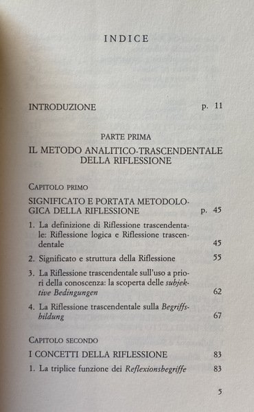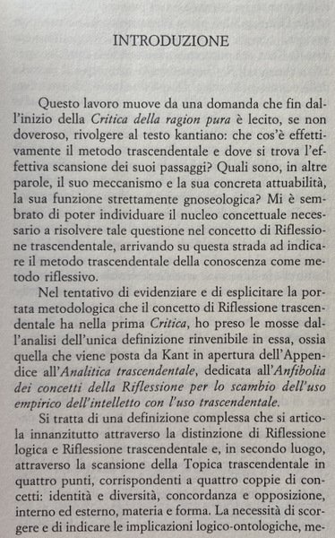 Questo lavoro muove da una domanda che fin dal l'inizio della Critica della ragion pura è lecito, se non doveroso, rivolgere al testo kantiano: che cos'è effettivamente il metodo trascendentale e dove si trova l'effettiva scansione dei suoi passaggi? Quali sono, in altre parole, il suo meccanismo e la sua concreta attuabilità, la sua funzione strettamente gnoseologica? Mi è sembrato di poter individuare il nucleo concettuale necessario a risolvere tale questione nel concetto di Riflessione trascendentale, arrivando su questa strada ad indicare il metodo trascendentale della conoscenza come metodo riflessivo.