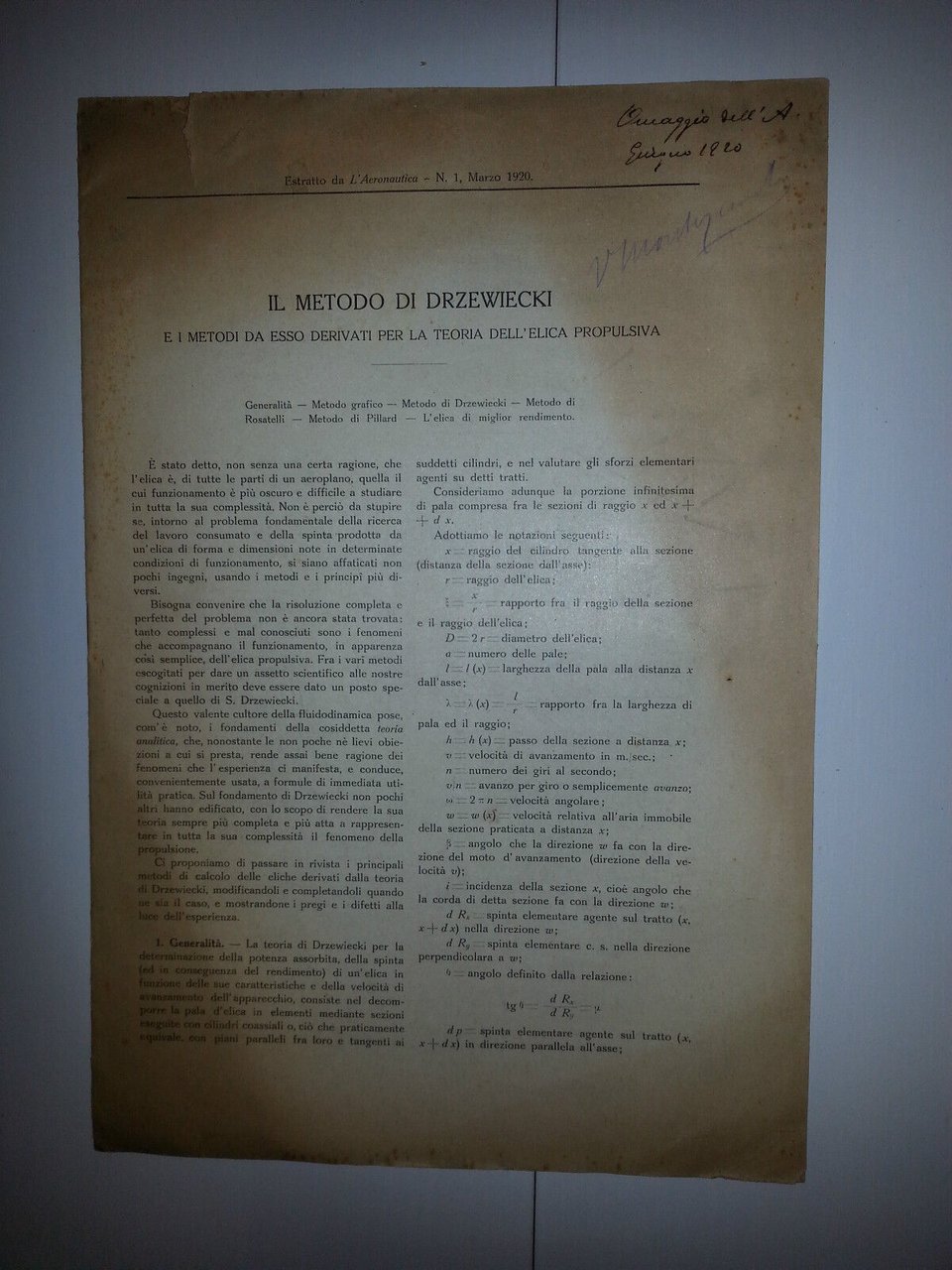 IL METODO DI DRZEWIECKI E METODI DA ESSO DERIVATI PER LA TEORIA DELL'ELICA PROPULSIVA ESTRATTO DA L'AERONAUTICA N.1 MARZO 1920In