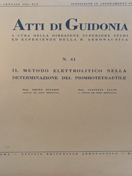 IL METODO ELETTROLITICO NELLA DETERMINAZIONE DEL PIOMBOTETRATILE SQUEO IGNAZIO CIANETTI ELVIO ATTI DI GUIDONIA N.41 1941 UFFICIO EDITORIALE AERONAUTICO