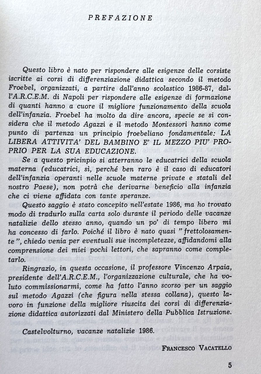 PREFAZIONE. Questo libro è nato per rispondere alle esigenze delle corsiste iscritte ai corsi di differenziazione didattica secondo il metodo Froebel, organizzati, a partire dall'anno scolastico 1986-87, dall'A.R.C.E.M. di Napoli per rispondere alle esigenze di formazione di quanti hanno a cuore il migliore funzionamento della scuola dell'infanzia. Froebel ha molto da dire ancora, specie se si considera che il metodo Agazzi e il metodo Montessori hanno come punto di partenza un principio froebeliano fondamentale: LA LIBERA ATTIVITÀ DEL BAMBINO È IL MEZZO PIÙ PROPRIO PER LA SUA EDUCAZIONE. Se a questo principio si atterranno le educatrici della scuola materna (educatrici, sì, perché ben raro è il caso di educatori dell'infanzia operanti nelle scuole materne private e statali del nostro Paese), non potrà che derivarne beneficio alla infanzia che ci viene affidata con tante speranze. Questo saggio è stato concepito nell'estate 1986, ma ho trovato modo di tradurlo sulla carta solo durante il periodo delle vacanze natalizie dello stesso anno, quando un po' di tempo libero mi ha concesso di farlo. Poiché il libro è nato quasi frettolosamente, chiedo venia per eventuali sue incompletezze, affidandomi alla comprensione dei miei pochi lettori, che sapranno come completarlo. Ringrazio, in questa occasione, il professore Vincenzo Arpaia, presidente dell'ARCEM, l'organizzazione culturale, che ha voluto commissionarmi, come ha fatto l'anno scorso per un saggio sul metodo Agazzi (che figura nella stessa collana), questo lavoro in funzione della migliore riuscita dei corsi di differenziazione didattica autorizzati dal Ministero della Pubblica Istruzione. Castelvolturno, vacanze natalizie 1986.