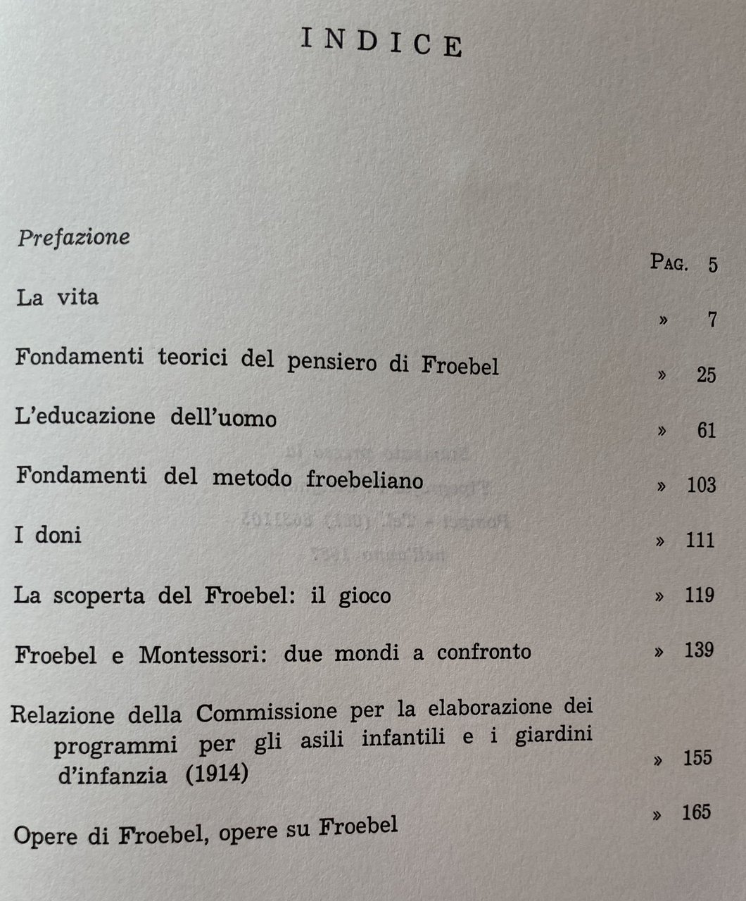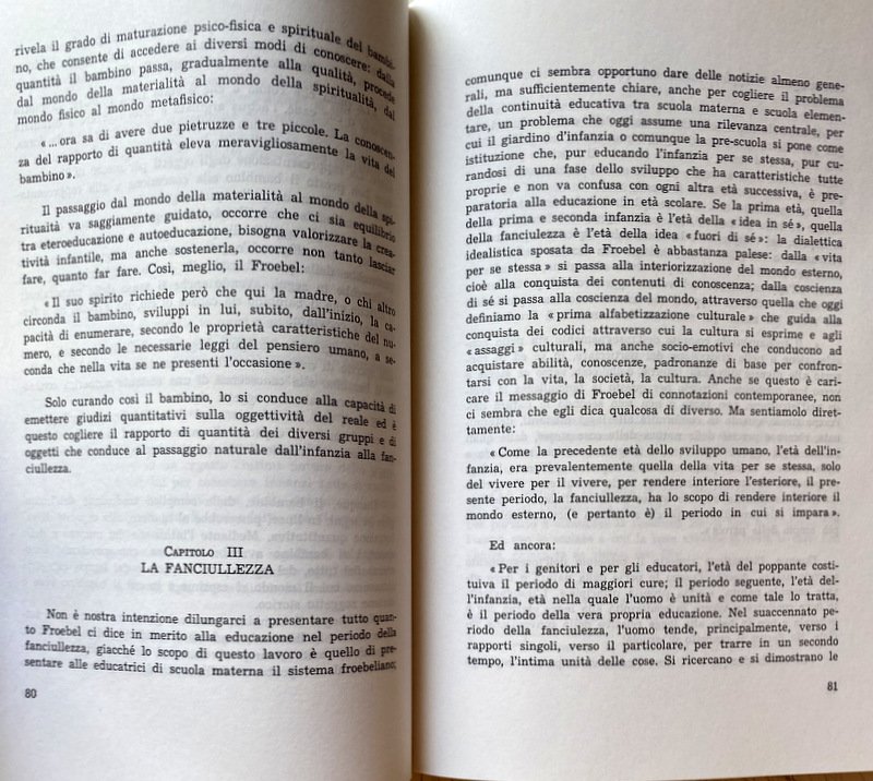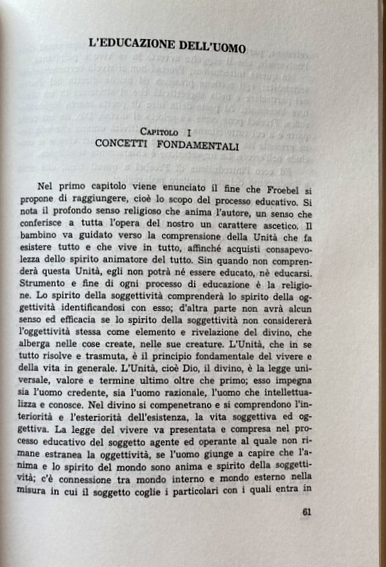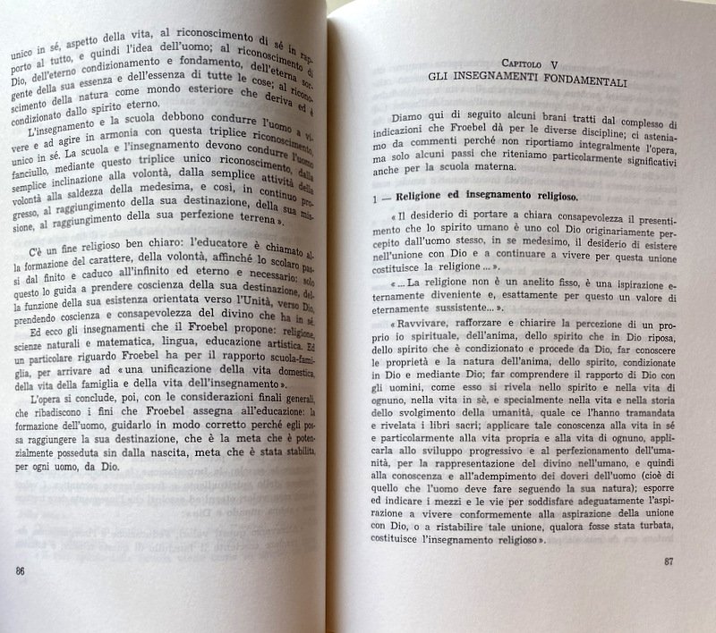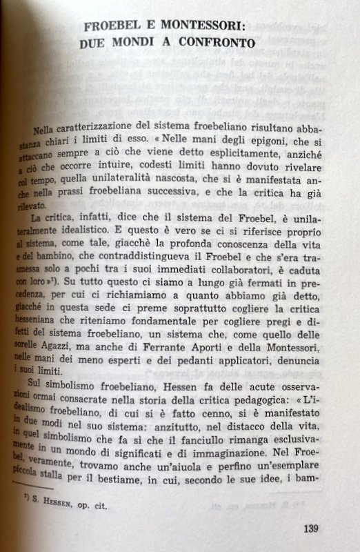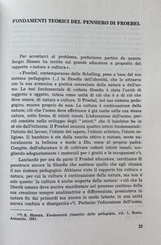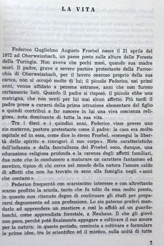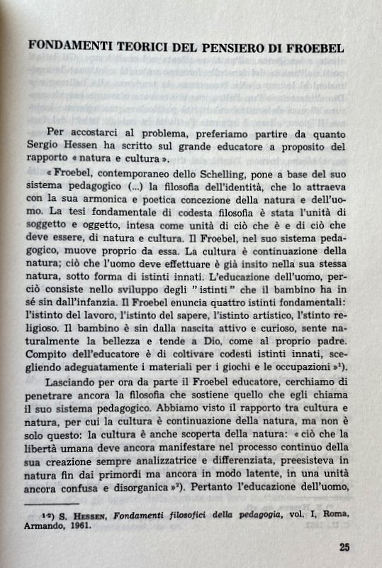Soggetti: Friedrich Froebel, Bambini, Pedagogia, Formazione, Kindergarten, Giardino d'infanzia, Didattica, Scuola Materna, Asilo, Apprendimento, Esperienza, Gioco, Maria Montessori, Carolina, Rosa Agazzi, Scuola materna, Didattica, Johann Prüfer, Jean Piaget, Bruner, Mauro Laeng, Psicopedagogia, Insegnamento, Bambini, Educazione speciale, Disabilità, Competenze, Metodi educativi, Metodo, Aldo Agazzi, Maestri, Istruzione, Coordinazione motoria, Capacità sensoriale, Socializzazione, Relazioni, Interazione, Comunicazione, Guide Didattiche, Insegnanti, Educatori, Intelligenza, Andrea Canevaro, Fanciulli, Elementari, Le chiacchiere della madre, Roberto Mazzetti, Sociologia, Integrazione, Giovacchino Petracchi, Sviluppo psico-fisico, Personalità, Religione, Friedrich Schiller, Cattolicesimo, Comportamento, Famiglia, Genitori, Programmazione, Materiale didattico, Sussidi, Sperimentazione, Comunità, Classi, Obbligo scolastico, Giacomo Cives, Bibliografia, Riferimento, Saggistica, Libri rari Vintage fuori catalogo, Sviluppo cognitivo, Emozioni, Affettività, Aggressività, Narcisismo, Egocentrismo, Adattamento, Pensiero logico simbolico, Parole, Linguaggio, Autismo, Giochi, Attività, Empatia, Johann Heinrich Pestalozzi, Rouseau, Schelling, Natura, William Middendorf, Heinrich Langenthal, Attenzione, Franco Frabboni, Georges Mauco, Claparède, Bovet, Rousseau, Binet, Louvain, Decroly, Gaston Mialaret, Sinascel, Giuseppe Lombardo-Radice, Eduard Spranger, Weiss, Doni, Palla, Sfera, Cubo, Cilindro, Romanticismo, Potenzialità, Osservazione, Esercizio tattile, Separazione, Ricostruzione, Mutter und Koselieder, Pädagogik, Familien der Erziehenden, Novalis, Pedagogisti tedeschi, Vittorino da Feltre, Pietro Pasquali, Sergio Hessen, Fondamenti, Principi, Filosofia, Lavoro, Sapere, Istinti, Arte, Creatività, Francesco De Bartolomeis, Ercole Baraldi, Kant, Fichte, Dio, Fanciullezza, Ferrante Aporti, Idealismo, Adolfo Pick, Franco Frabboni, Tedeschi, Maria Gabrielli, Giovanni Marchesini, Emilia Formíggini Santamaria, Ernesto Codignola, J. Hughes, Bowen Couthorp, Paulo Freire, John Dewey, Friedrich Froebel, Children, Pedagogy, Training, Kindergarten, Didactics, Learning, Experience, Game, Didactics, Psychopedagogy, Teaching, Children, Special education, Disability, Skills, Educational methods, Method, Teachers, Education, Motor coordination, Sensory ability, Socialization, Relationships, Interaction, Communication, Teaching Guides, Teachers, Educators, Intelligence, Children, Elementary school, Mother's chatter, Sociology, Integration, Psycho-physical development, Personality, Religion, Catholicism, Behaviour, Family, Parents, Programming, Educational material, Aids, Experimentation, Community, Classes, Compulsory schooling, Bibliography, Reference, Nonfiction, Rare books out of print, Cognitive development, Emotions, Affectivity, Aggression, Narcissism, Egocentrism, Adaptation, Thinking Symbolic logic, Words, Language, Games, Activity, Empathy, Nature, Attention, Gifts, Ball, Sphere, Cube, Cylinder, Romance, Potential, Observation, Tactile exercise, Separation, Reconstruction, German pedagogues, Fundamentals, Principles, Philosophy, Work, Knowledge, Instincts, Creativity, God, Childhood, Idealism