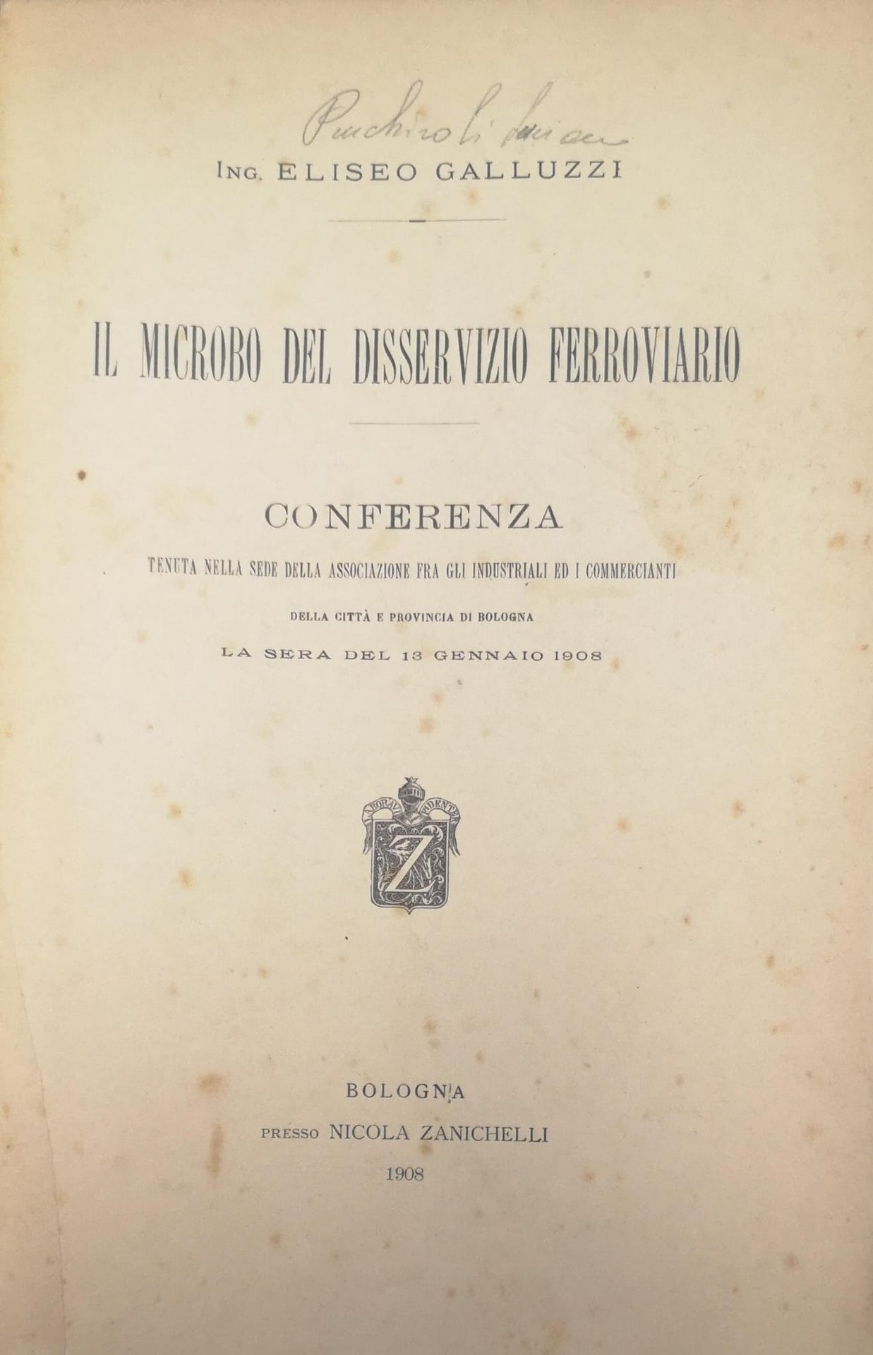 In-8 gr., brossura editoriale (dorso restaurato; lievi fioriture), pp. (4),72. Conferenza tenuta nella sede della Associazione fra gli Industriali ed i Commercianti della città e provincia di Bologna la sera del 13 Gennaio 1908. Pagine leggermente ingiallite per la qualità della carta, peraltro esemplare ben conservato.