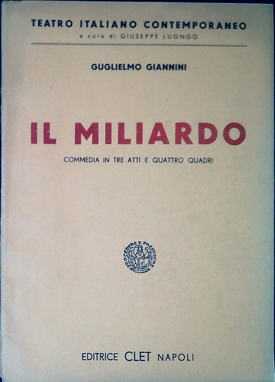 Giannini, Guglielmo Il miliardo : commedia in tre atti e quattro quadri. Napoli, C. L. E. T. 1942, 51 p. ; 24 cm. (49204)