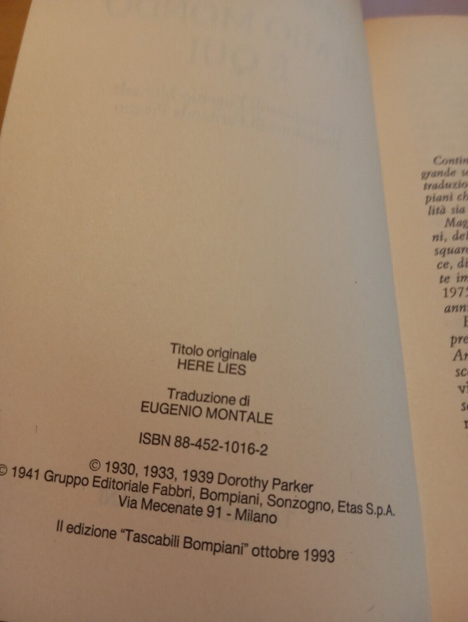 Il mio mondo è qui, Dorothy Parker, Bompiani, F. Pivano, E. Montale, 1993