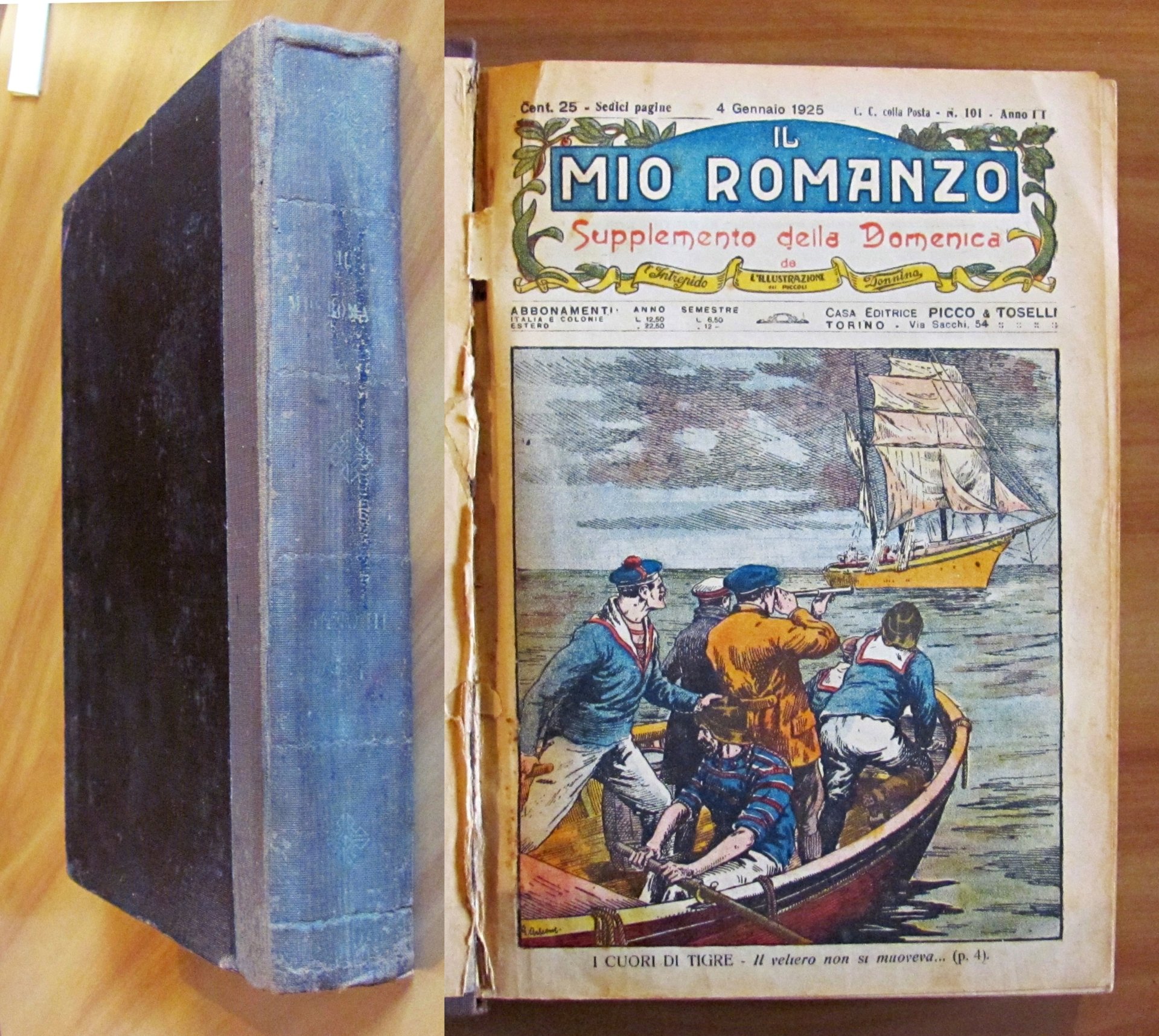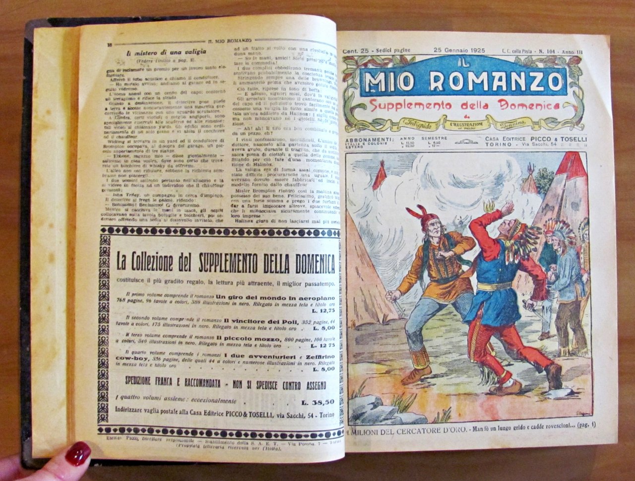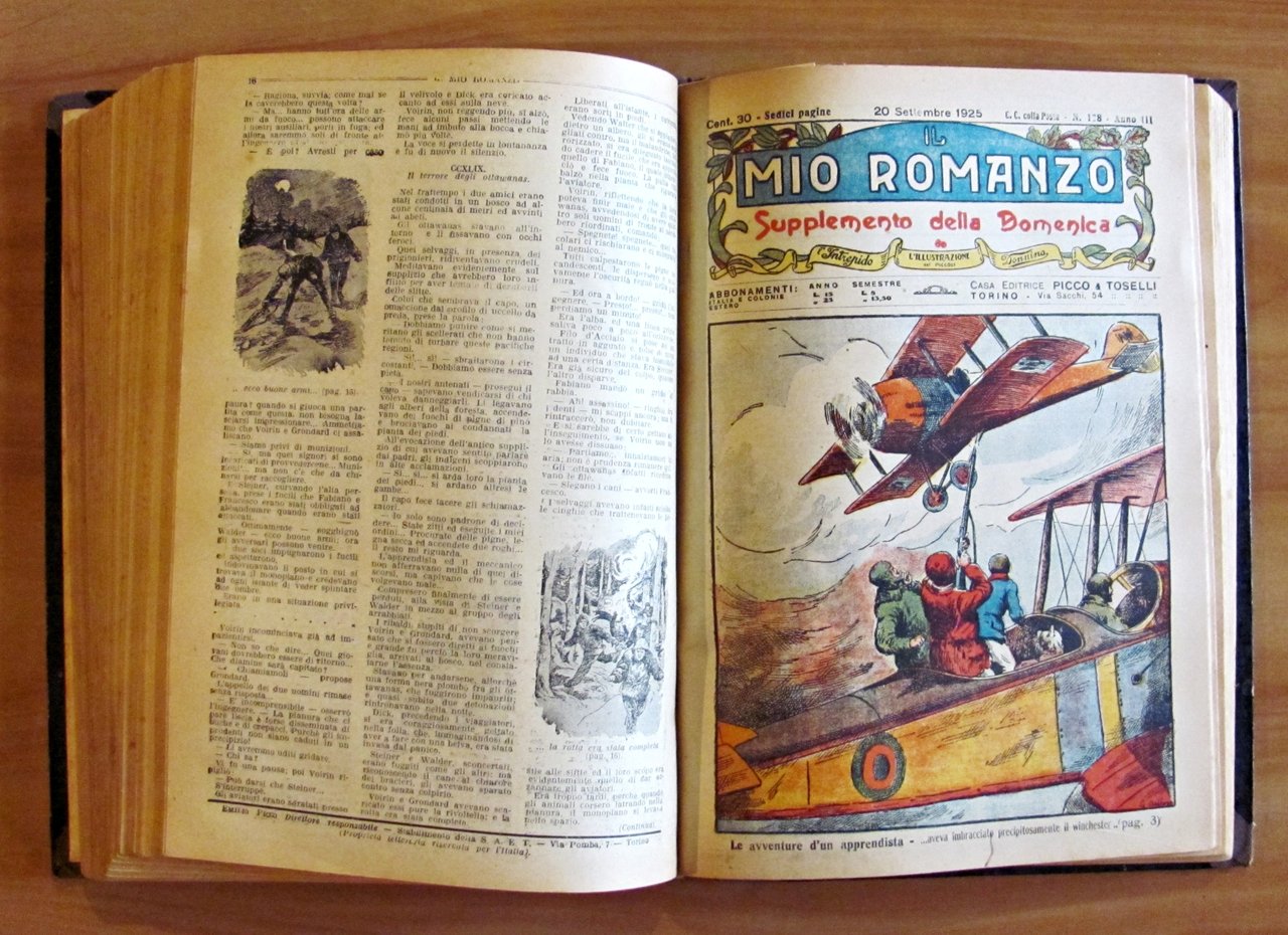 Raccolta Anno III - 101/152. Copertina, 1 illustrazione a colori n.t. e diverse illustrazioni in b/n in ciascun fascicolo. Dal fascicolo 141 al 152 non c'è l'illustrazione a colori al centro. Ed. Picco e Toselli - Torino, 1925. Opera in 51 fascicoli rilegati in mezza tela. La sola prima pagina presenta imperfezioni alla cerniera. Il fascicolo 139 ha una mancanza di un paio di centimetri in basso a pagina 5 e 11. 20x28: pp.16 cadauno. BUONISSIMO STATO , Molto buono (Very Good)
