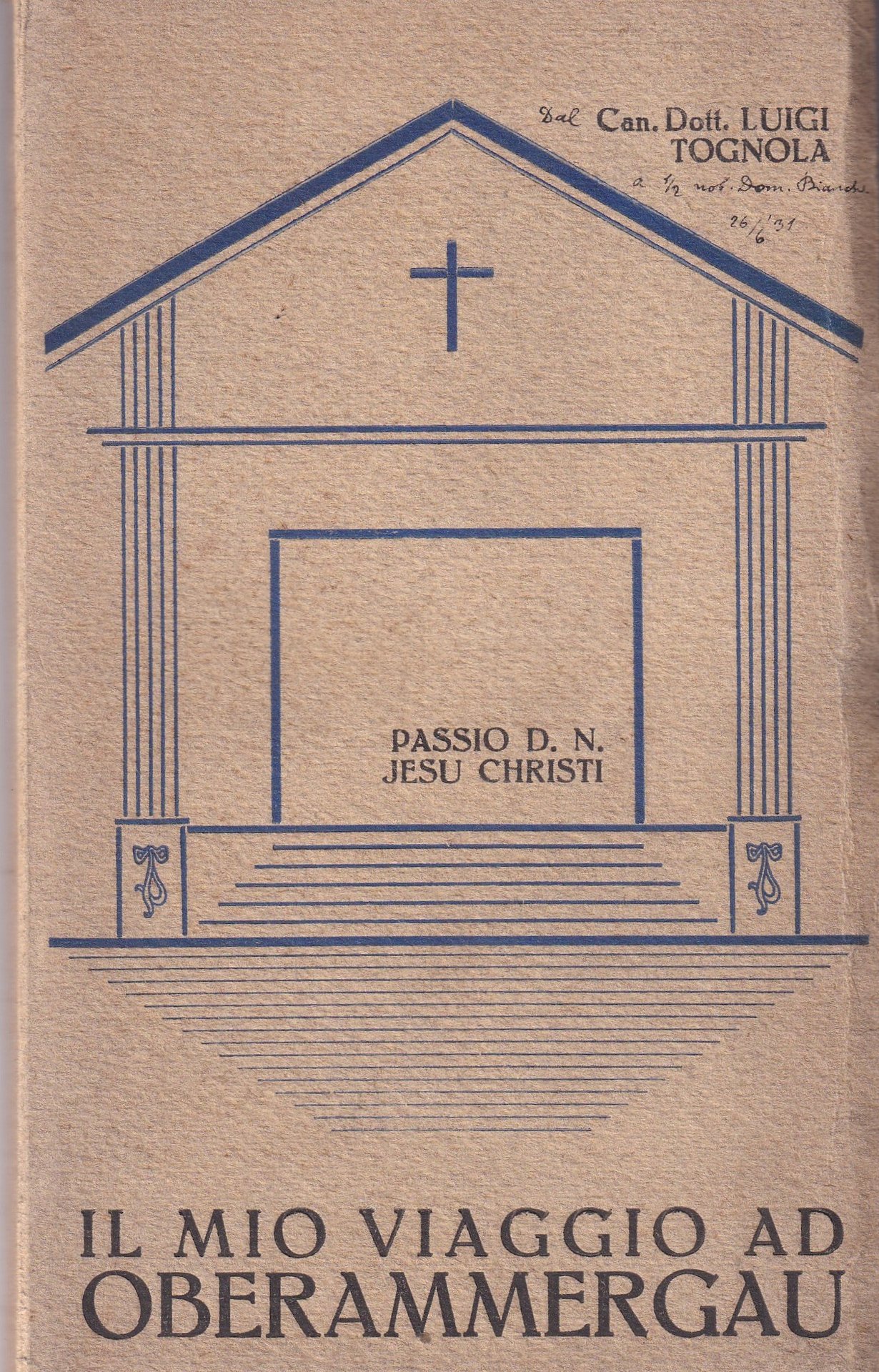 In 16°, br. edit. ill. (invio dell'autore al piatto ant.), pp. 112,(2), con ill. b.n. f.t.; sporadiche fioriture sparse; resoconto della Rappresentazione della Passione di Cristo che si svolge ogni dieci anni a Oberammergau cittadina della Baviera in Germania; ottimo es.