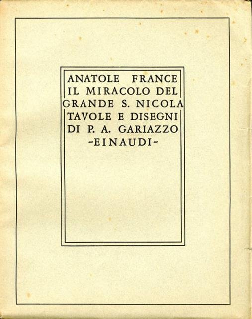 50 p., [12] c. di tav. : ill. ; 33 x 25 cm. Leggende d'oro. Tiratura limitata 1/985 esemplare, copia n. 322. Volume stampato su carta Ingres grigia delle Cartiere Miliani di Fabriano. Brossura editoriale lievi tracce d'uso e del tempo, titolo al piatto inquadrato ed al dorso, sguardie, occhiello con al verso giustificazione della tiratura (985) e della numerazione (copia n. 322), tavola d'antiporta protetta da velina, frontespizio, le tavole sono tutte protette da velina, illustrazioni nel testo. Opera di Anatole France grande scrittore, biografo, giornalista e critico letterario francese, premio Nobel per la letteratura nel 1921 illustrata magistralmente da Pietro Antonio Paolo Gariazzo, detto Pier Antonio (Torino, 7 giugno 1879 – Torino, 10 gennaio 1964) - pittore, incisore, scrittore e cineasta. Codice libreria 360.