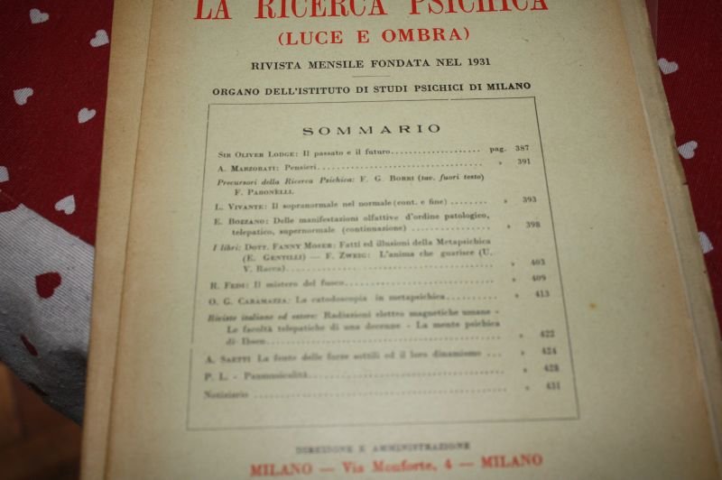 CODICE 4012, LA RICERCA PSICHICA LUCE E OMBRA SETTEMBRE 1936 FASC 9, SOMMARIO, IL PASSATO E IL FUTURO SIR OLIVER LODGE, PENSIERI DI A MARZORATI, IL SOPRANORMALE NEL NORMALE, LEONE VIVANTE, DELLE MANIFESTAZIONI OLFATTIVE D'ORDINE PATOLOGICO TELEPATICO SUPERNOMALE, E.BOZZANO, DA PAG 386 A PAG 432