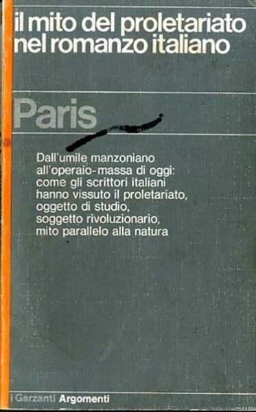 177 p. ; 18 x 11 cm. I Garzanti. Argomenti, 32. Dall'umile manzoniano all'operaio massa di oggi: come gli scrittori italiani hanno vissuto il proletariato, oggetto di studio, soggetto rivoluzionario, mito parallelo alla natura. Brossura editoriale, coperta in cartoncino flessibile di colore grigio con impresso il titolo al piatto e al dorso. Qualche segno del tempo alla coperta e ai risvolti della coperta, ingiallimento delle pagine, per il resto libro integro. Codice libreria 7965.